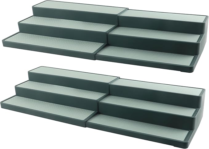 • SET INCLUDES: The 3 tier shelf set comes with 2 racks, the 3 levels increase visibility and easy access to the items on your kitchen counter or cabinets. Deep shelves helps to prevent spills from spreading.