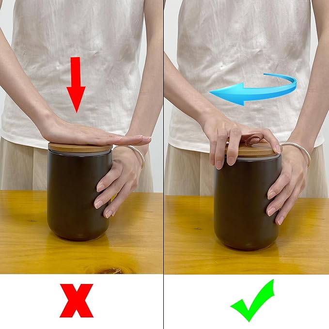 • Easy to Refill & Clean: The wide-mouth design allows for quick scooping, refilling, or cleaning. The ceramic jar is dishwasher safe, while the bamboo lid must be hand washed and dried promptly. Tips; To ensure proper sealing, press the lid downward while twisting it at the same time—do not push it straight down without rotation.