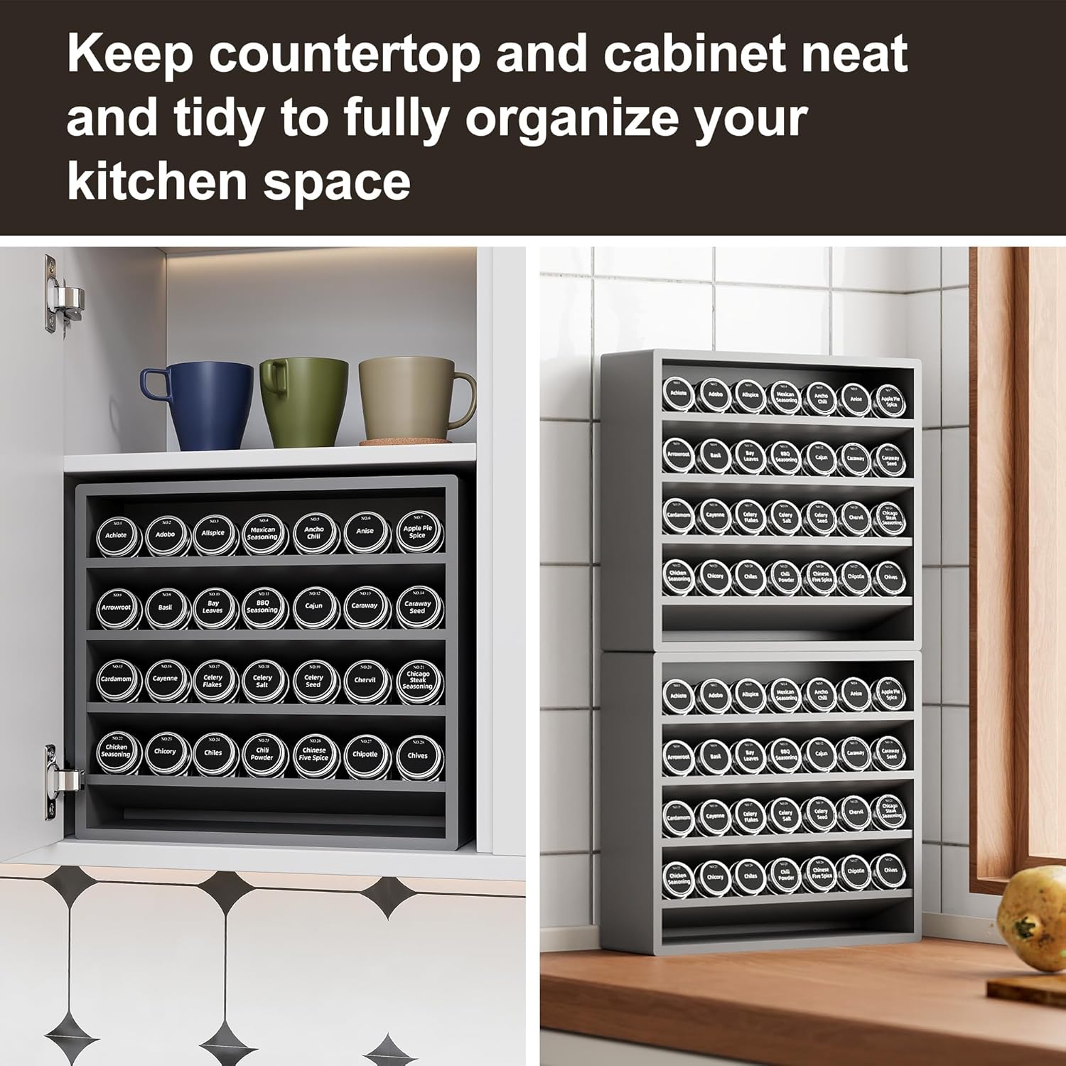 • Multiple Scenarios: You can place the spice shelf on the cabinet or tabletop to keep countertops, cabinets and shelves tidy and fully organize your cabinet space.