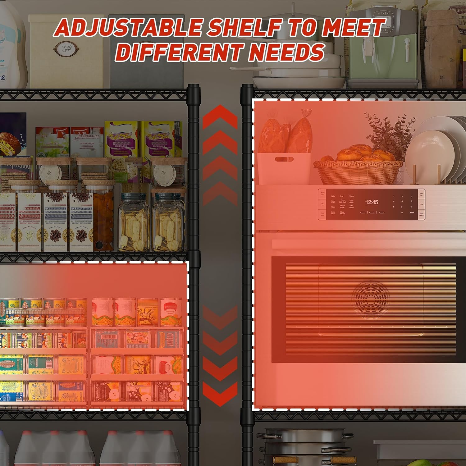 • 【60"W Metal Shelving Unit】The garage shelving measure 60"W x 18"D x 65.5"H. The capacity of the shelf is twice as much as the pantry shelves, easily meet your storage needs. Also perfect for various spaces such as garage, pantry room, kitchen, living room, office, warehouse, commercial exhibition, hotel, supermarket, etc.