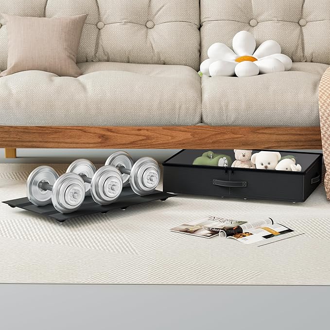 • [Strong Weight-Bearing Capability]: Made of durable oxford fabric, our underbed storage is built to withstand heavy weights. The bottom bracket is reinforced with hard wood, providing superior support compared to other elastic band structures. You can confidently store items weighing up to 40 pounds, such as books, However, when placing heavy objects above, please be careful to move slowly to prevent the wheels from being damaged by excessive lateral force!