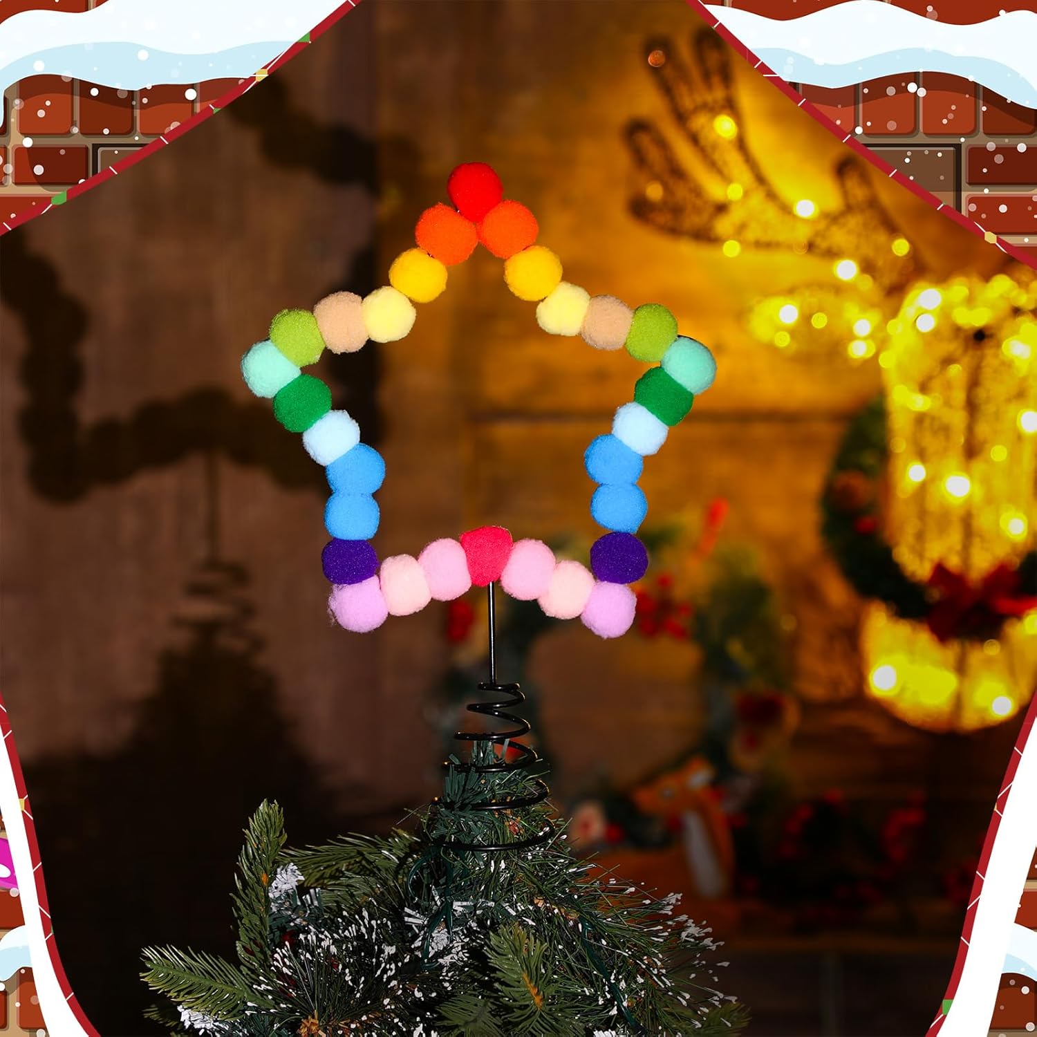Rainbow Felt Ball Star Christmas Tree Topper Colorful Pom Pom Felt Ball Xmas Tree Topper Colorful Five Pointed Star Xmas Ornaments for Decoration(8.3 x 7.1 Inch)