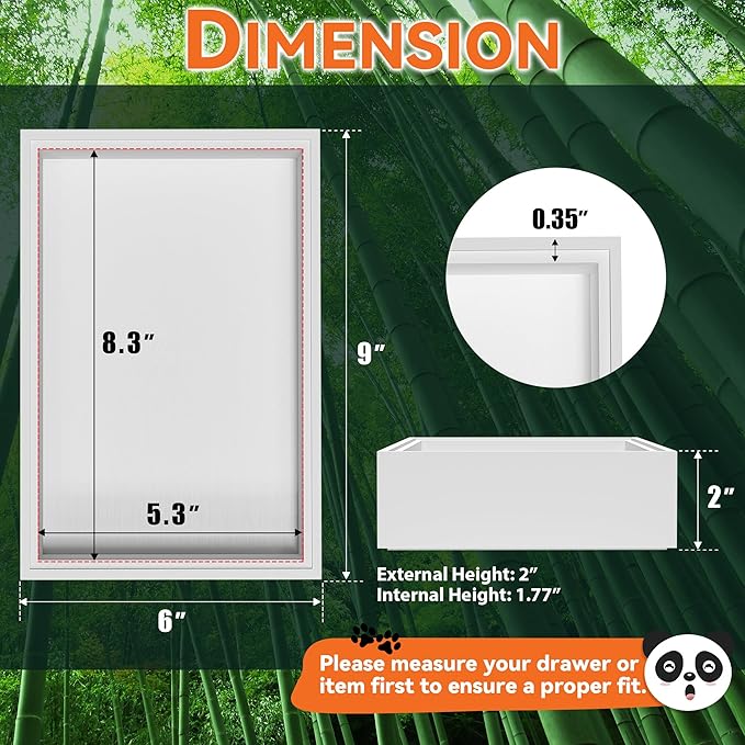 • Each bamboo drawer organizer measures: external size: 9" L x 6" W x 2" H; internal size: 8.3" L x 5.3" W x 1.77" H. Please check the size before purchasing