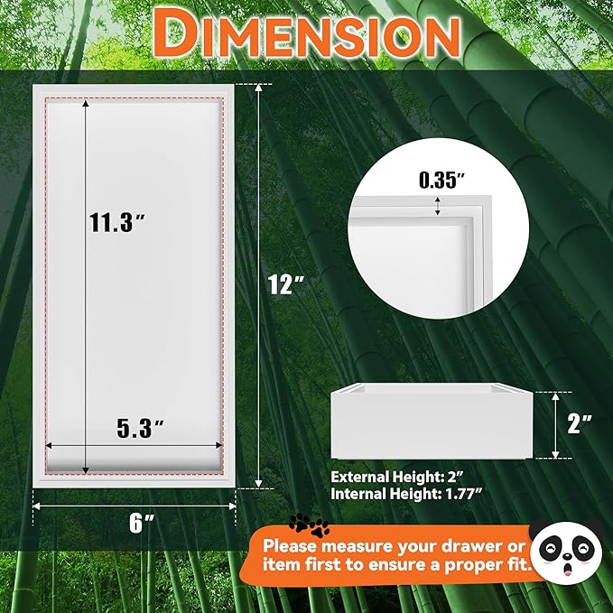 • Each bamboo drawer organizer measures: external size: 12" L x 6" W x 2" H; internal size: 11.3" L x 5.3" W x 1.77" H. Please check the size before purchasing
