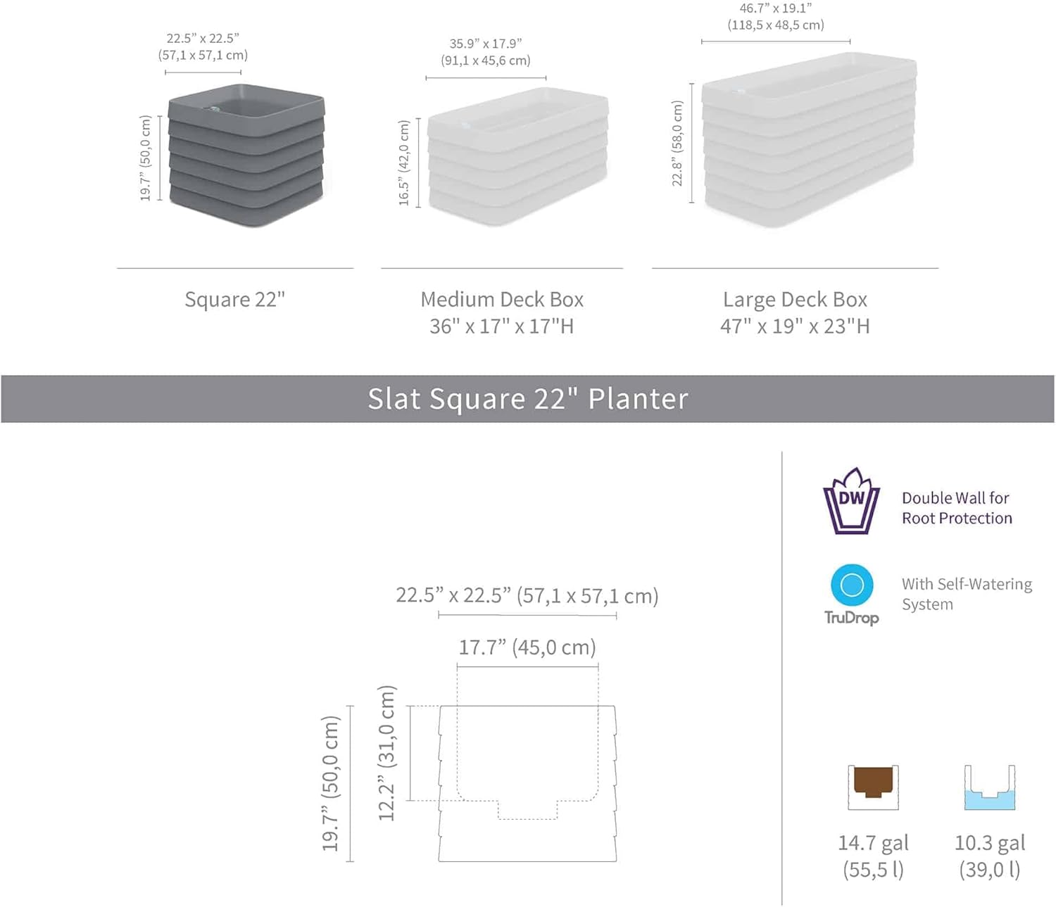 Crescent Garden TruDrop Self Watering Slat Square Box Planter - Indoor Outdoor Planter Box with Built-in Reservoir & Water Level Indicator, All Weather Flower Pot, 22'' (Caviar Black)