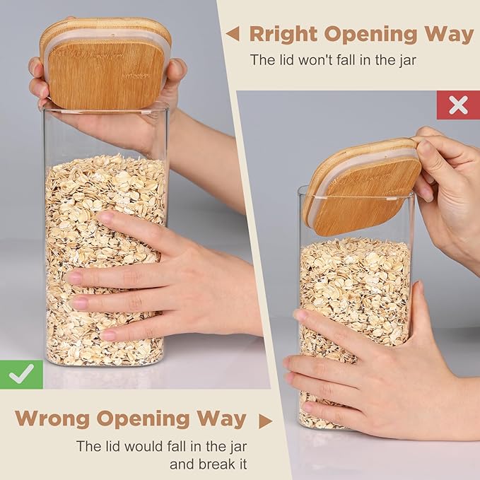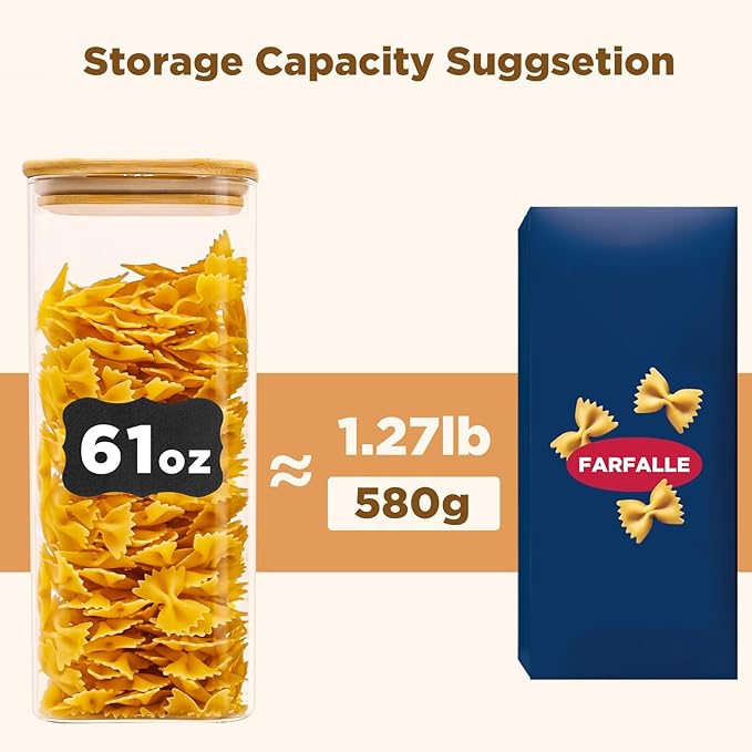 • [Premium quality and safety assurance] Our glass containers with bamboo lids are made of premium quality and borosilicate glass, glass pantry storage containers can withstand the harsh tests of daily use. The bamboo lid provides an airtight seal, ensuring the freshness of stored food. Our glass food storage jars are BPA Free, Phthalate Free, PVC Free, Lead Free, They are healthy and reliable choice for your kitchen.