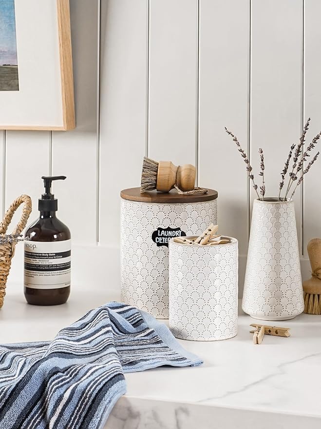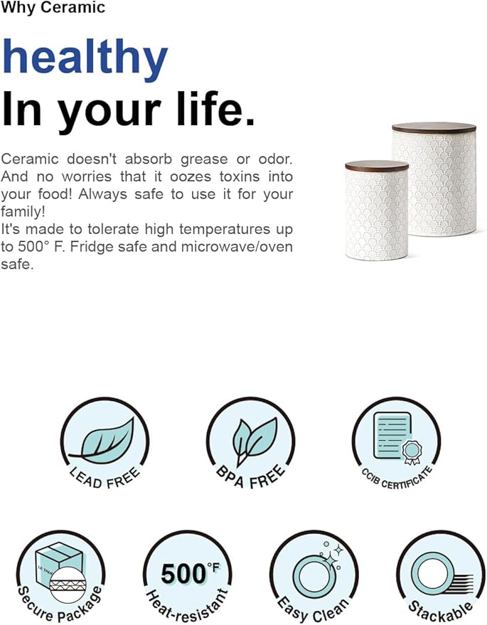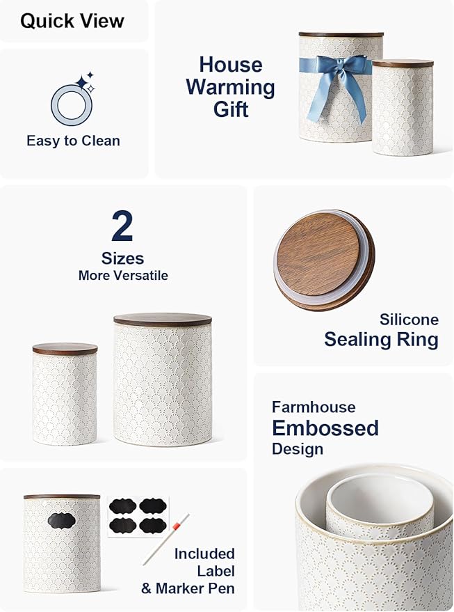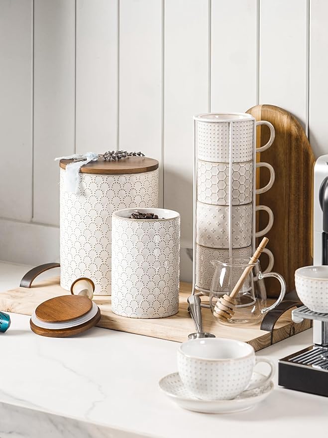 • Embossed Design: Featuring an arctic white glaze with a charming embossed pattern, these farmhouse-style ceramic jars will add warmth and vitality to your home. Their elegant design complements various home styles, making them the perfect addition to your countertop or coffee corner. Enhance your home’s aesthetics and let these jars become a standout decorative element in your living space