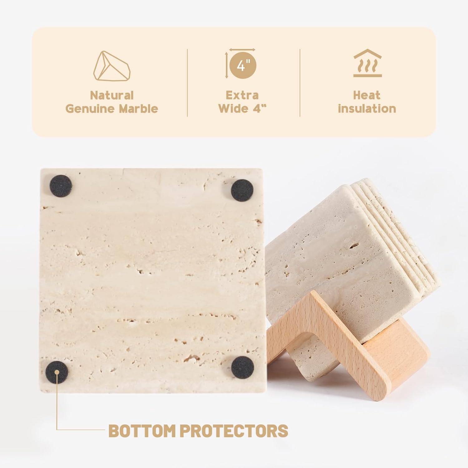 BCS Square Marble Coasters Set of 6 with Holder - Premium Travertine Drink Coasters for Coffee Table, Durable Cup Mats for Wine, Beer, Cocktails - Elegant Home & Bar Decor