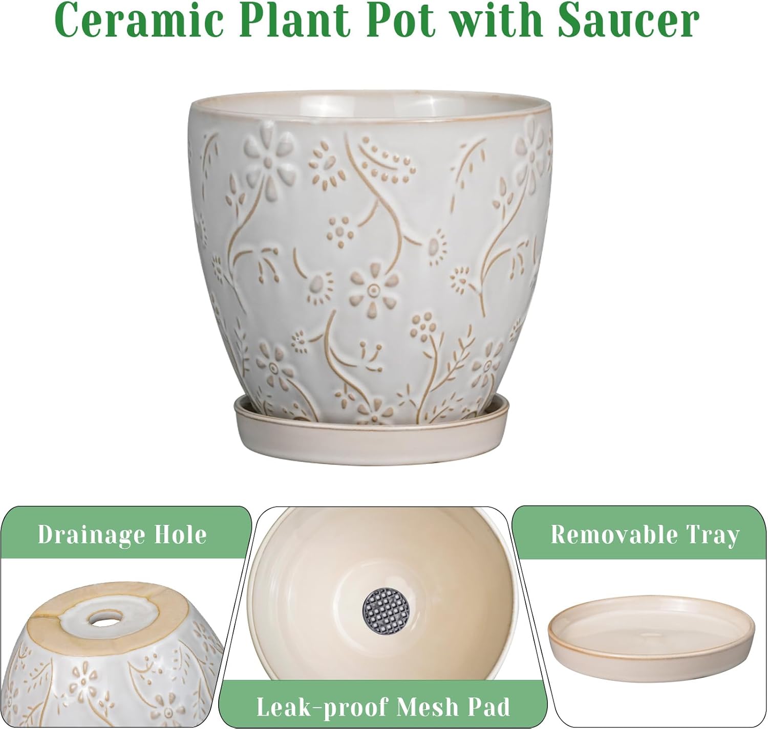 • Plant Pot with Drainage Hole and Saucer: This white plant pot with drainage holes allow for easy plant drainage, beneficial for plant respirationthe, ceramic tray to collect excess water, and the leak-proof mesh reduce soil erosion