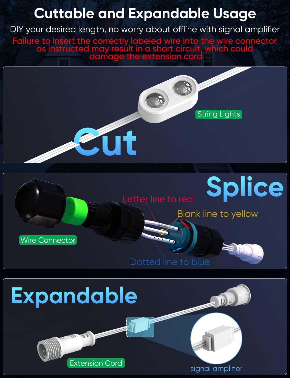 • Cuttable and Expandable: The outdoor permanent led lights can be cut and extended by connecting an extension cord through wire connector set when specific area encountered. The extension cord can amplifiy the signal, up to 32.8ft/10m, ensuring that the whole lights set maintains a stable signal. If it is necessary to cut the light string, please refer to the installation guide for the correct installation method. (Failure to insert the correctly labeled wire into the wire connector as instructed may result in a short circuit, which could damage the extension cord with signal amplifier)