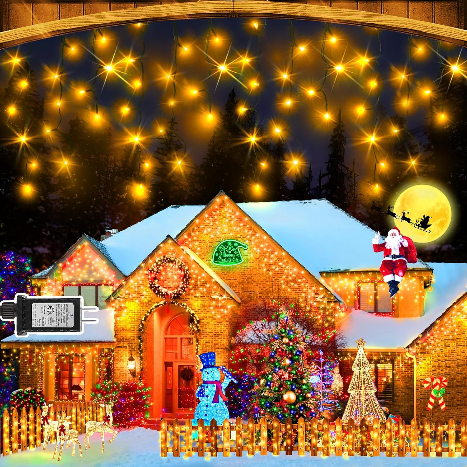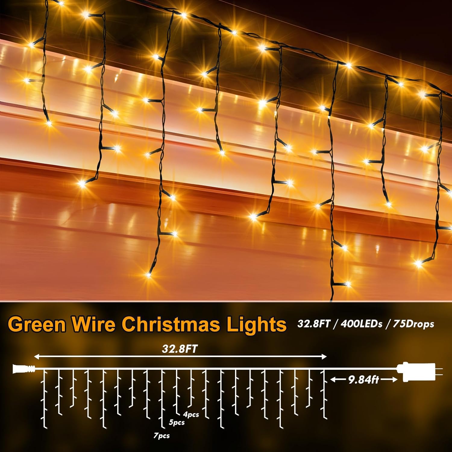 KNONEW 33FT 400 LED Christmas Lights Outdoor Black Wire String Lights with 75 Drops, 8 Lighting Modes, Timer Memory Function Connectable Hanging Curtain Lights for Halloween Party Decor (Warm White)