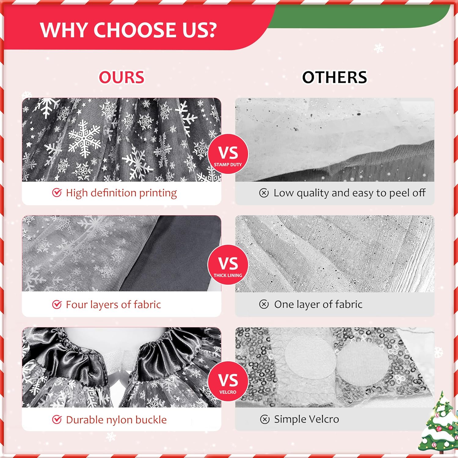 • Premium Material:This Xmas tree skirt is made of high quality material with 4 layers;1 layer of snowflake patterned tulle,2 layers of sheer tulle, and a layer of polyester fabric;fluffy material will make Christmas tree transform into a lovely princess