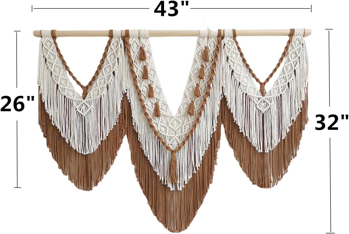 • Large Woven Tapestry: 43'' W x 32'' H (from top to the ends of longest fringe) This macrame wall hanging is great for a bedroom, living area, workspace, or anywhere where you'd like to bring some texture and interest to your walls.