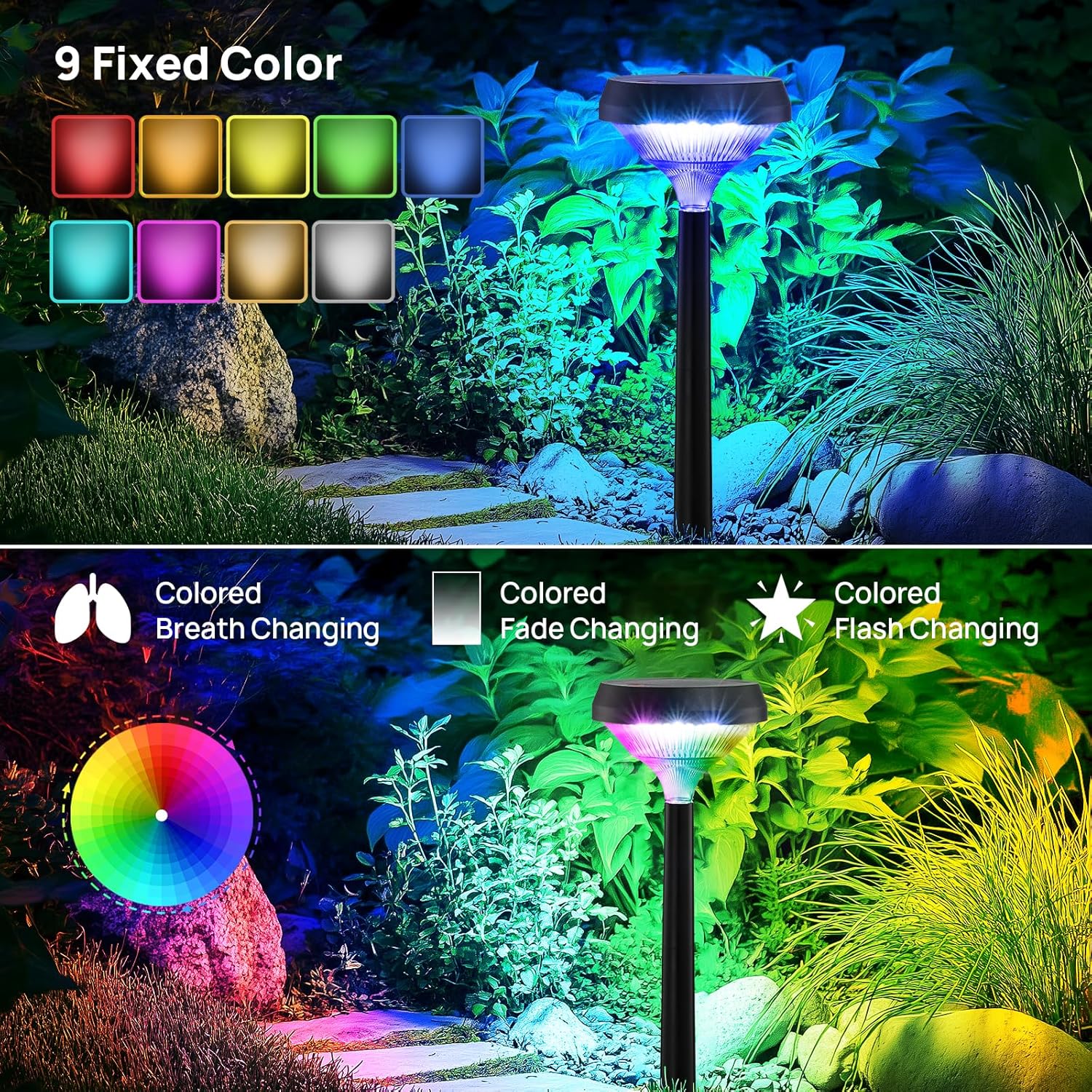 • 【Color Changing+Warm White+Cool White】Color changing solar pathway lights have 9 fixed light modes (Red,Orange,Yellow,Green,Blue,Indigo,Purple,Warm White, Cool White) and 3 color cycling modes (Colored Breath Changing, Colored Fade Changing, Colored Flash Changing). It's a perfect choice for Halloween, Christmas or daily decorations