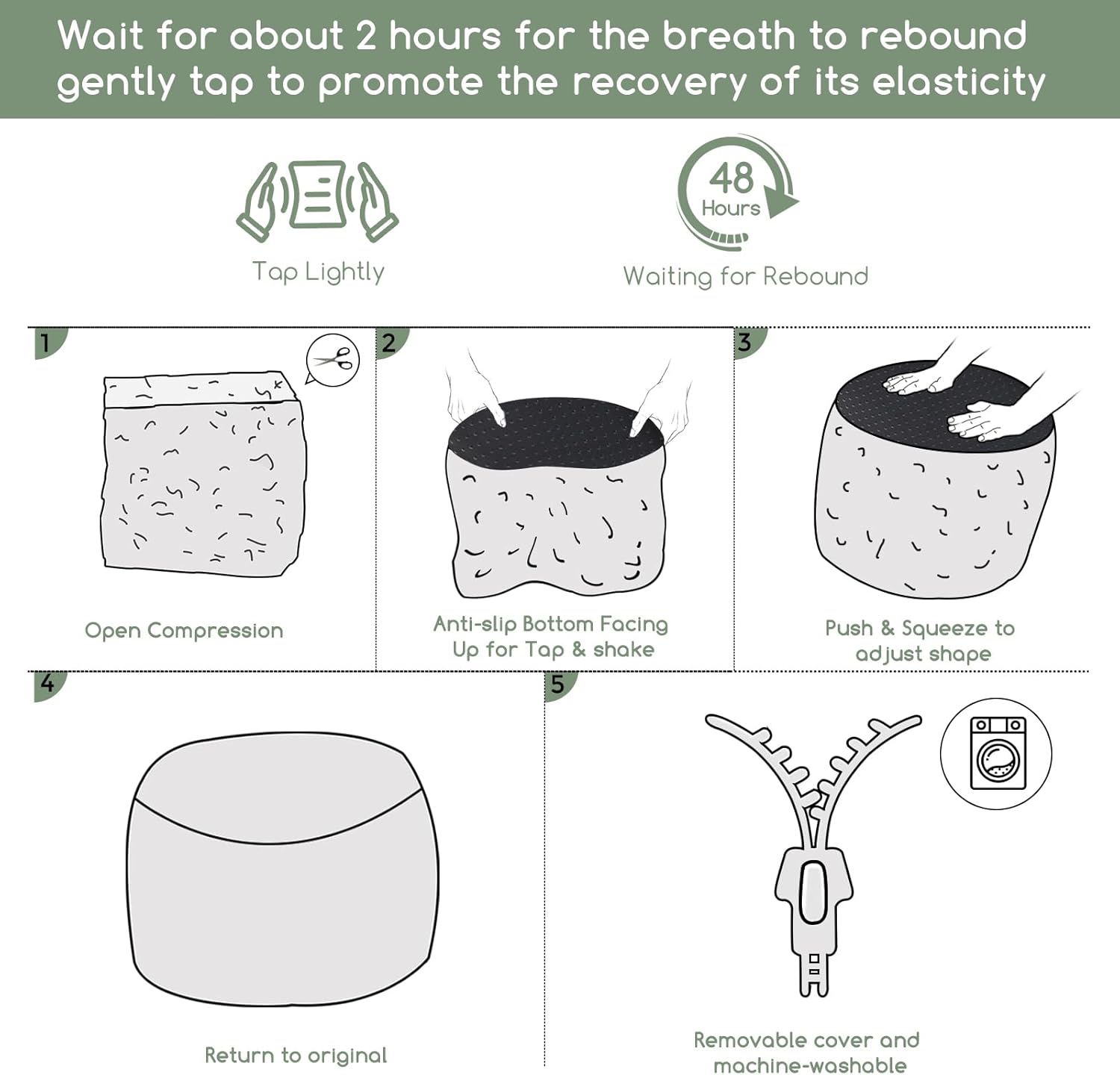 • For convenience and ease of use, this pouf ottoman comes pre-filled with memory foam chunk pouf filler, which can be easily inserted through the large round opening on the bottom with double zippers.