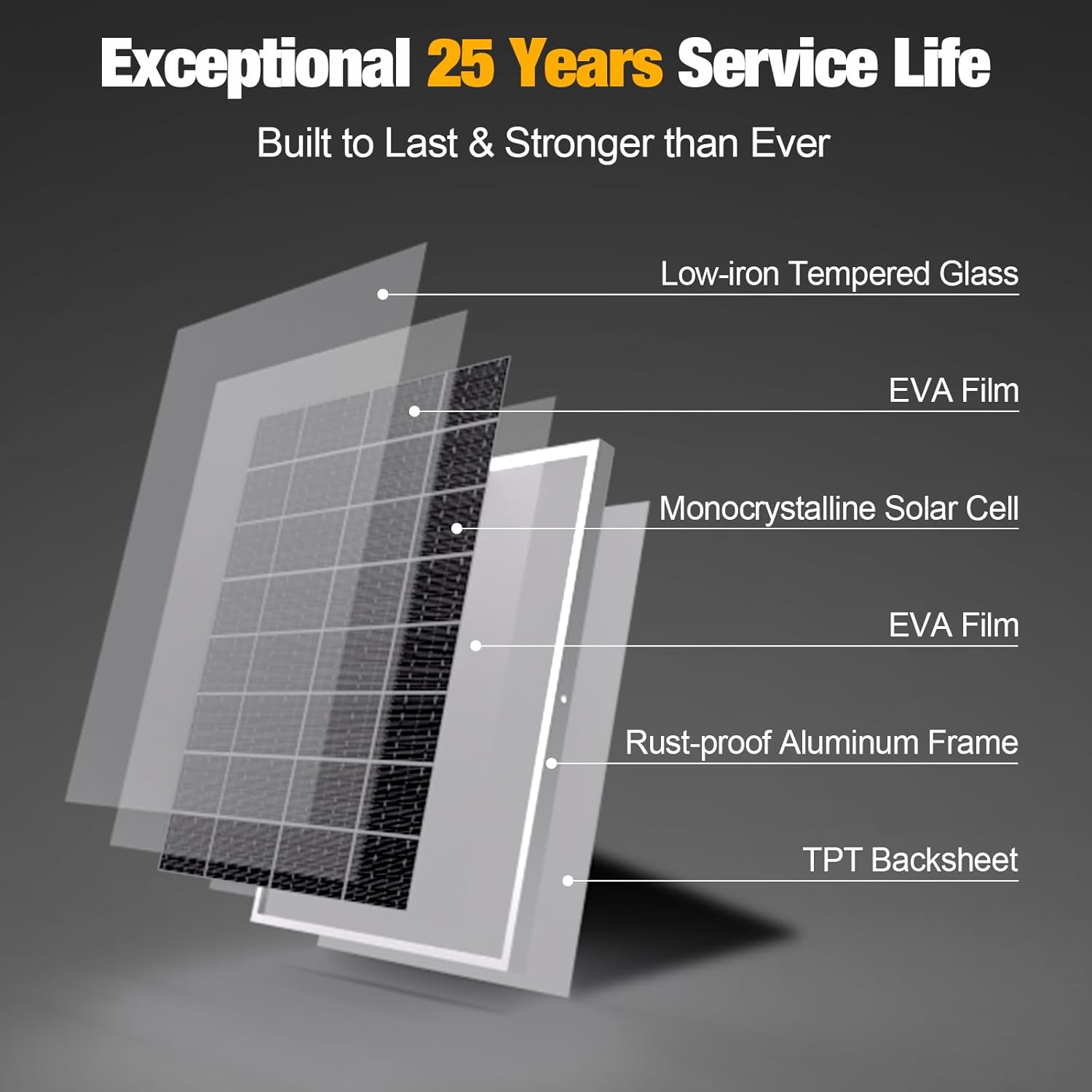 • 【Durable Design】Featuring a low-iron tempered glass surface and a corrosion-resistant aluminum frame, this solar panel is completely waterproof and rustproof, offering an impressive lifespan of up to 25 years. This 12V solar panel is engineered to endure harsh weather conditions, including sandstorms, high winds, thunderstorms, blizzards, and hail. It can handle wind pressures up to 2400Pa and snow loads of up to 5400Pa.
