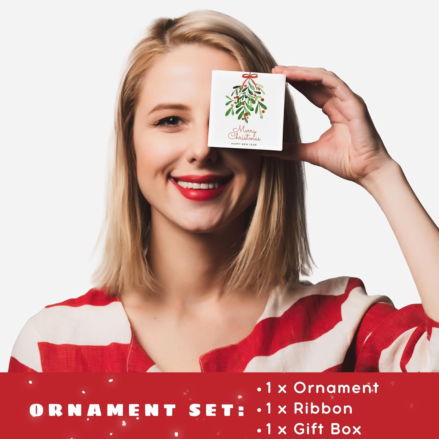 • ORNAMENT SET INCLUDES: You will receive 1x Two-sided Ceramic Ornament, 1x Beige Ribbon and 1x Gift Box. The small hole in the ornament is threaded with our shining beige ribbon for easy hanging, which creates an elegant look for your Christmas tree.