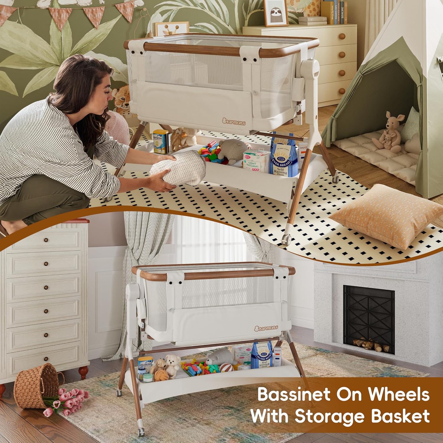 • SAFETY STRAPS AND LOCKABLE WHEELS:This bassinet bedside sleeper features safety straps for secure attachment to an adult bed and 360-degree rotating wheels for easy room-to-room movement, also serving as a standalone bassinet for versatile use as your child grows.