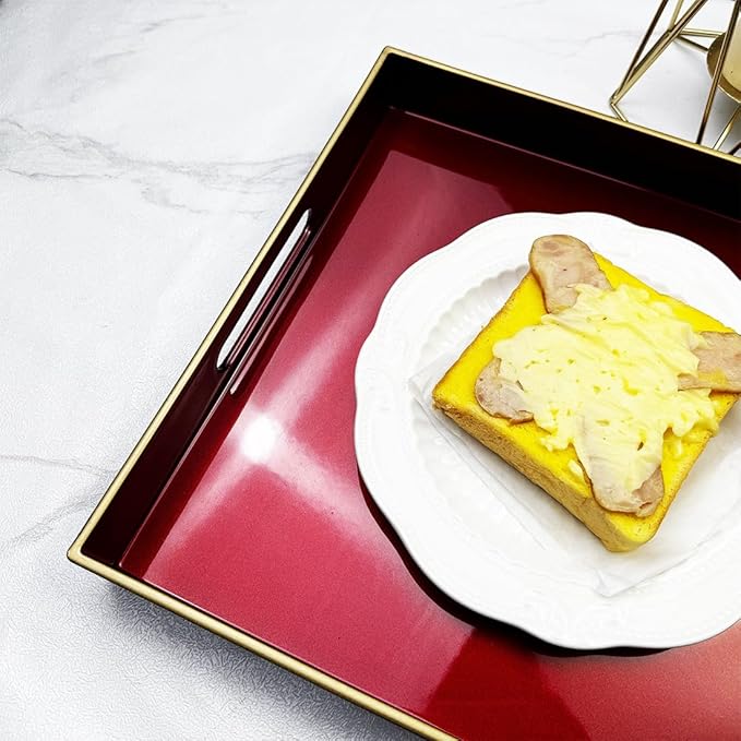 • Design: The size of the Emerald Red tray is 15.7 x 11.8 inches, and it has two built-inhandles for easy carrying. lt has asimple, solid color finish with agolden top rim accent, and theedges are relatively smooth.