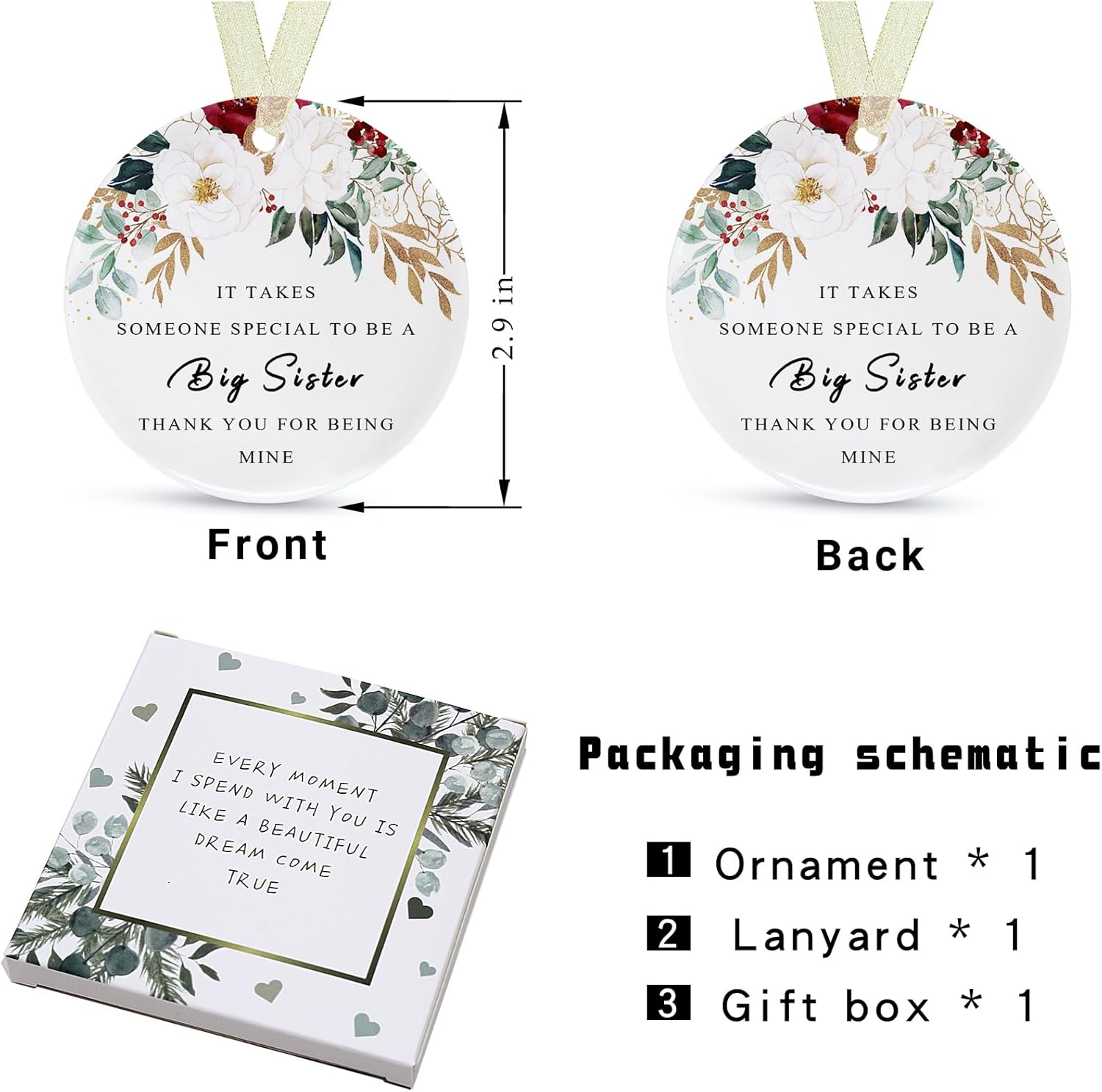 • 🌼【Perfect and delicate size】This is a sister memory ornament with a diameter of 2.9 inches and a thickness of only 0.18 inches. The product includes: a round sis ornamentt*1, a gift box*1 and a lanyard*1. The gift box comes with it makes it easy for you to give the best sis ever gifts directly to family and friends and other special people in your life, and the lanyard that comes with it helps to hang it easily on the Christmas tree or anywhere you want.