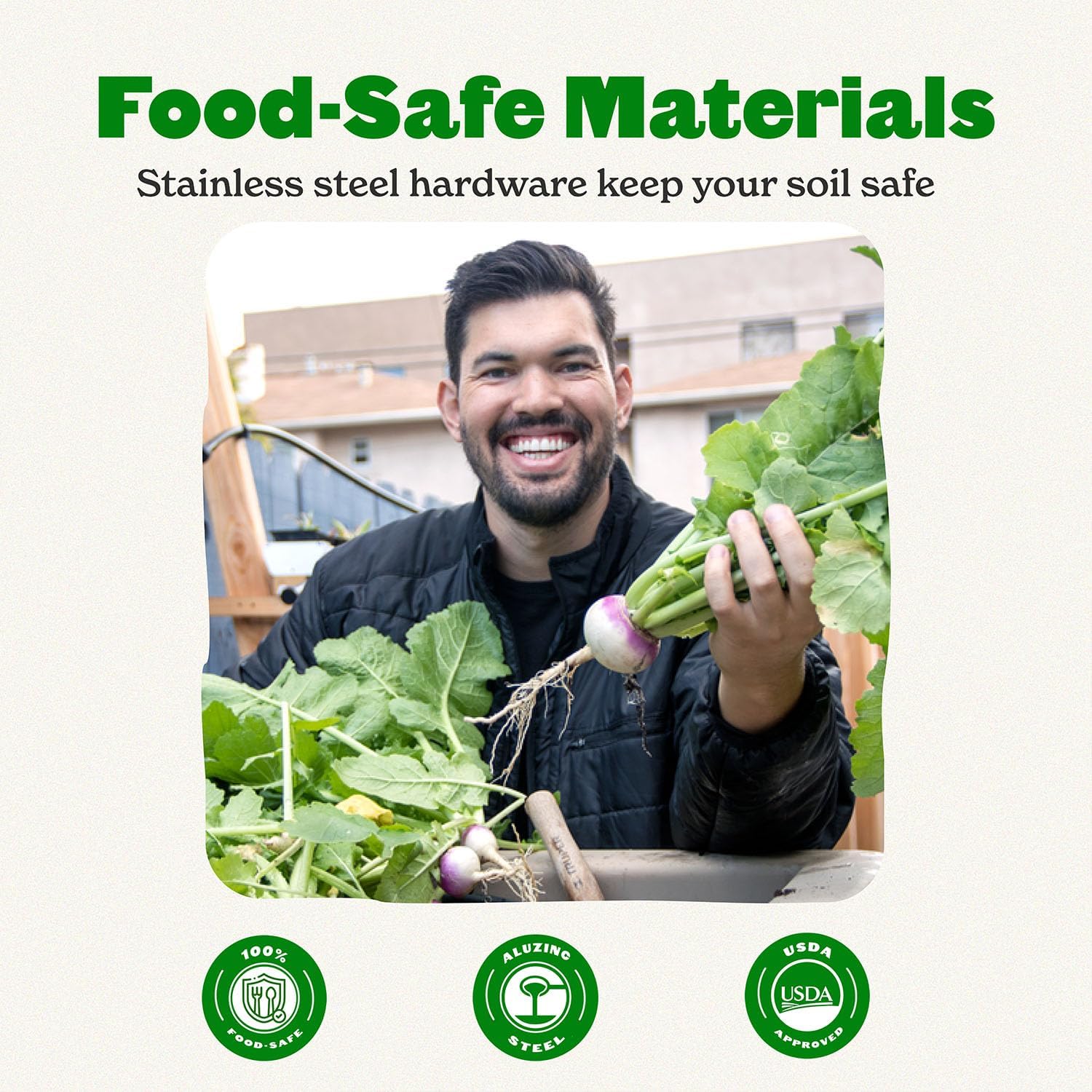 • Food-Safe and Eco-Friendly Materials Crafted with 100% food-safe aluzinc steel and stainless steel hardware, our planters keep your soil chemical-free for worry-free growing. Made using sustainable practices and recycled materials, our raised beds are perfect for eco-conscious gardeners.