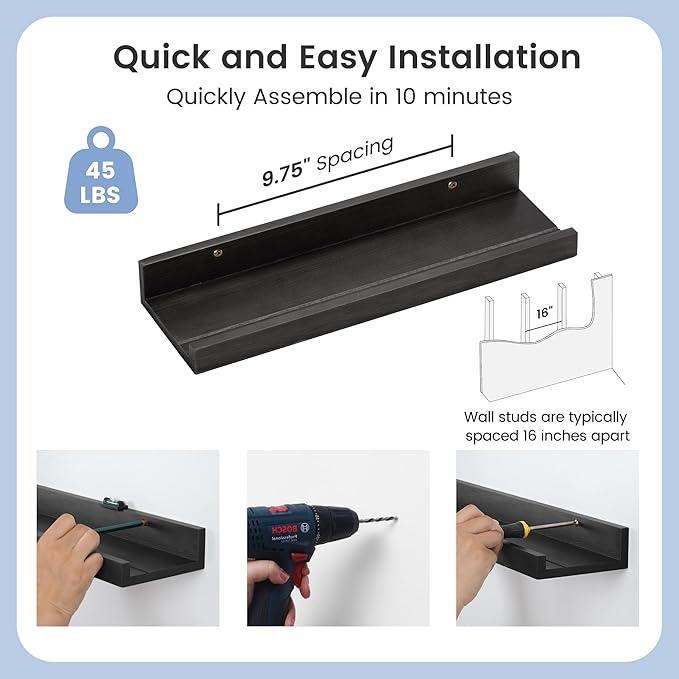 • Easy to Install: You will get a level, screws for the wall, drywall anchors, a detailed installation guide, and two beautiful hand-crafted solid pine wood shelves. With the level, you can make sure your picture ledge shelves are well aligned. Just follow the simple instruction to install the hanging shelves for wall decor within 10 minutes. We add additional screw and anchor to the hardware bag just in case. If you have any questions about our products, please feel free to contact us