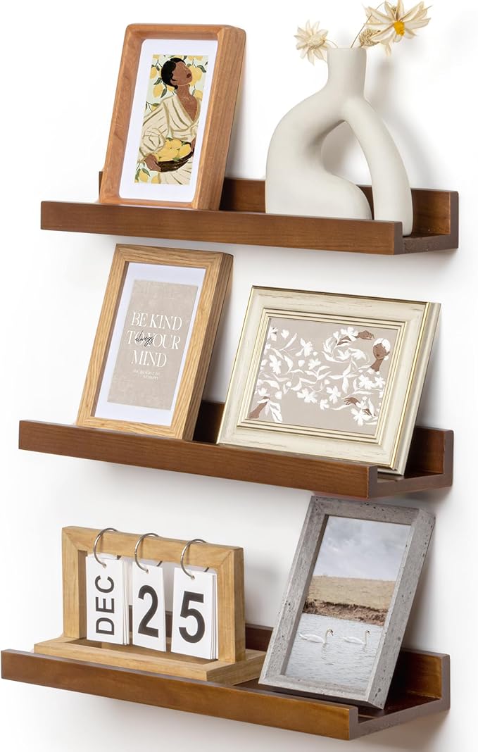 • Easy to Install: You will get a level, screws for the wall, drywall anchors, a detailed installation guide, and two beautiful hand-crafted solid pine wood shelves. With the level, you can make sure your picture ledge shelves are well aligned. Just follow the simple instruction to install the hanging shelves for wall decor within 10 minutes. We add additional screw and anchor to the hardware bag just in case. If you have any questions about our products, please feel free to contact us
