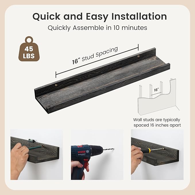 • Easy to Install: You will get a level, screws for the wall, drywall anchors, a detailed installation guide, and two beautiful hand-crafted solid pine wood shelves. With the level, you can make sure your picture ledge shelves are well aligned. Just follow the simple instruction to install the hanging shelves for wall decor within 10 minutes. We add additional screw and anchor to the hardware bag just in case. If you have any questions about our products, please feel free to contact us