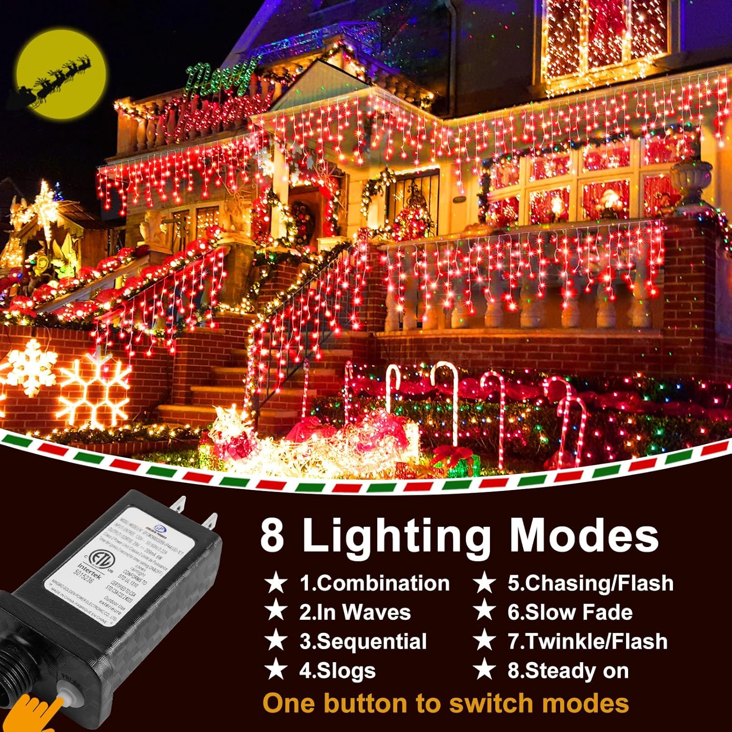 KNONEW Christmas Lights Outdoor Decorations 400 LED 33ft 8 Modes Curtain Fairy String Light with 75 Drops, Clear Wire LED Hanging Light Decor for Wedding Party Holiday Christmas Decorations (Red)