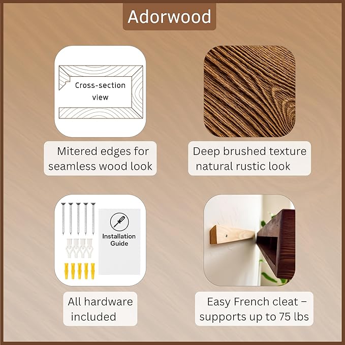 • LIGHTWEIGHT PIECE & EASY INSTALLATION: Hollow construction ensures it's lightweight for easy installation using a safe French cleat system, supporting up to 75 lbs. Includes a complete installation kit.