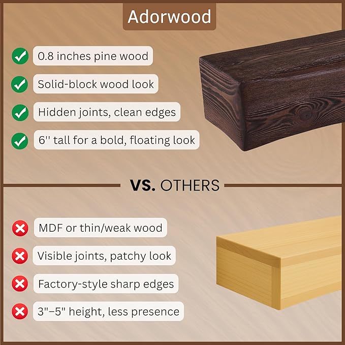 • GENUINE PINE WOOD TEXTURE: Each piece reveals natural knots, small cracks, and unique distressing, ensuring every mantel is one-of-a-kind. Due to the inherent characteristics of real wood, the grain and color may slightly differ from the samples shown.