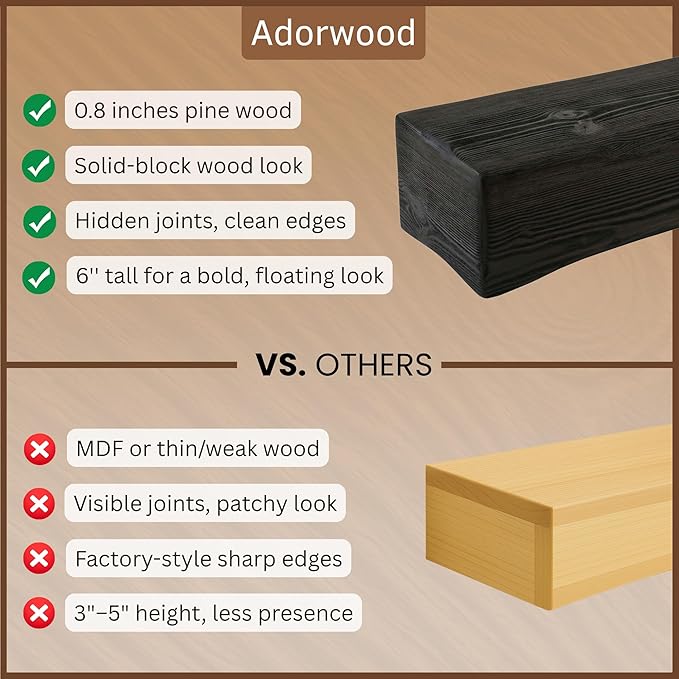 • GENUINE PINE WOOD TEXTURE: Each piece reveals natural knots, small cracks, and unique distressing, ensuring every mantel is one-of-a-kind. Due to the inherent characteristics of real wood, the grain and color may slightly differ from the samples shown.