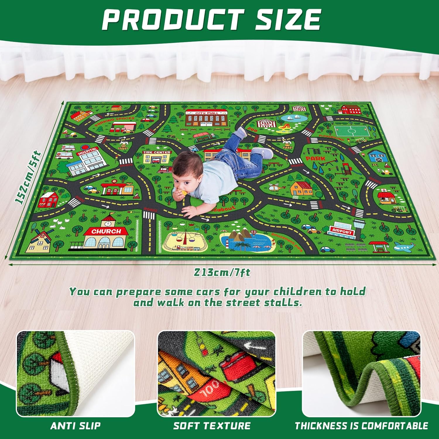• Non Slip Kids Playroom Rug: this road traffic playrug featured with non slip and soft texture, provides a cushiony playfield that ensures safety during vigorous play; With a reliable non slip bottom, there's no risk of slipping or sliding; This kid baby and toddler friendly playrug ensure soft play times