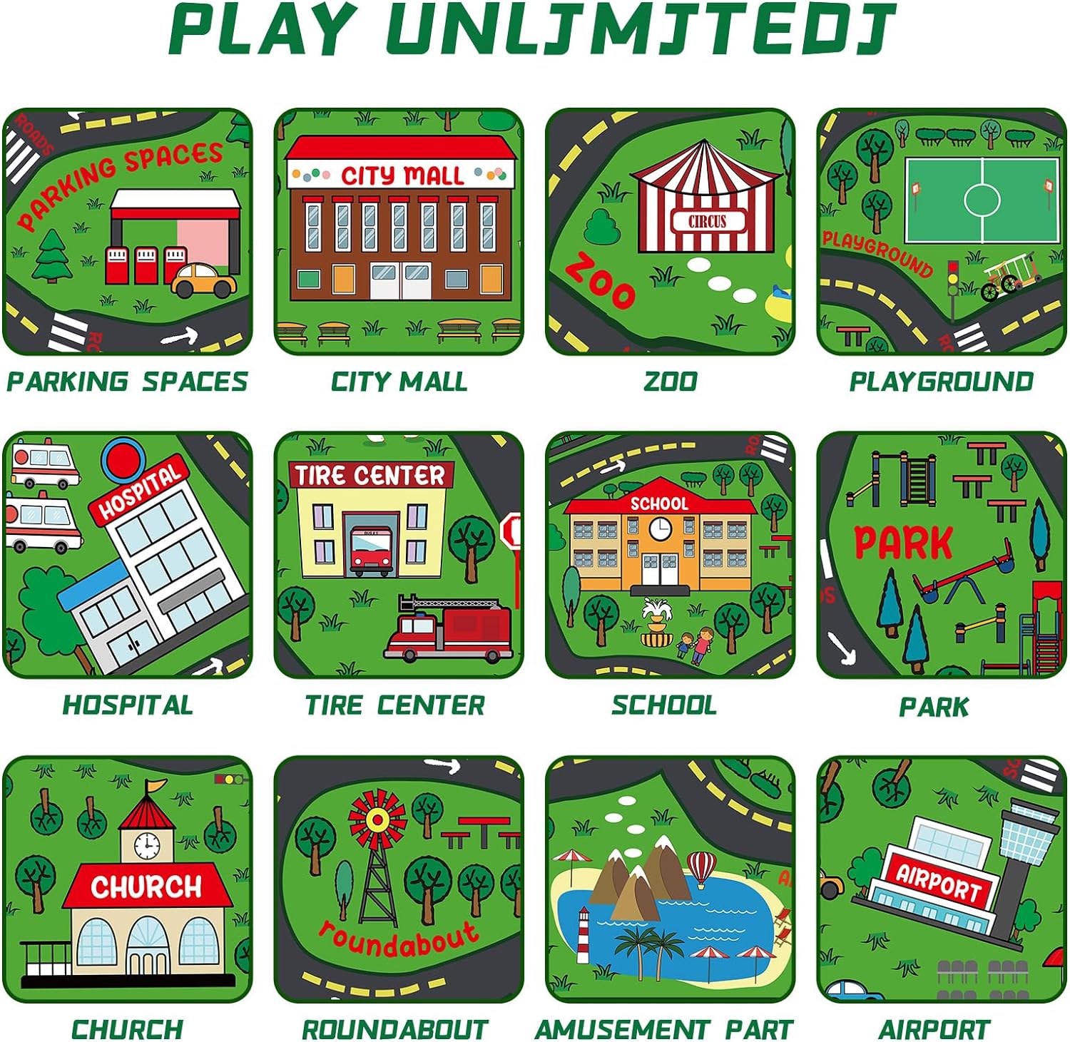 • City Life Traffic Road Car Play Rug: this kid playmat rug featured a city life theme, adorned with roads, race tracks, and vibrant illustrations of buildings, trees, and cars; Your child can drive their toy cars along the tracks, creating their own mini city and exploring different scenarios