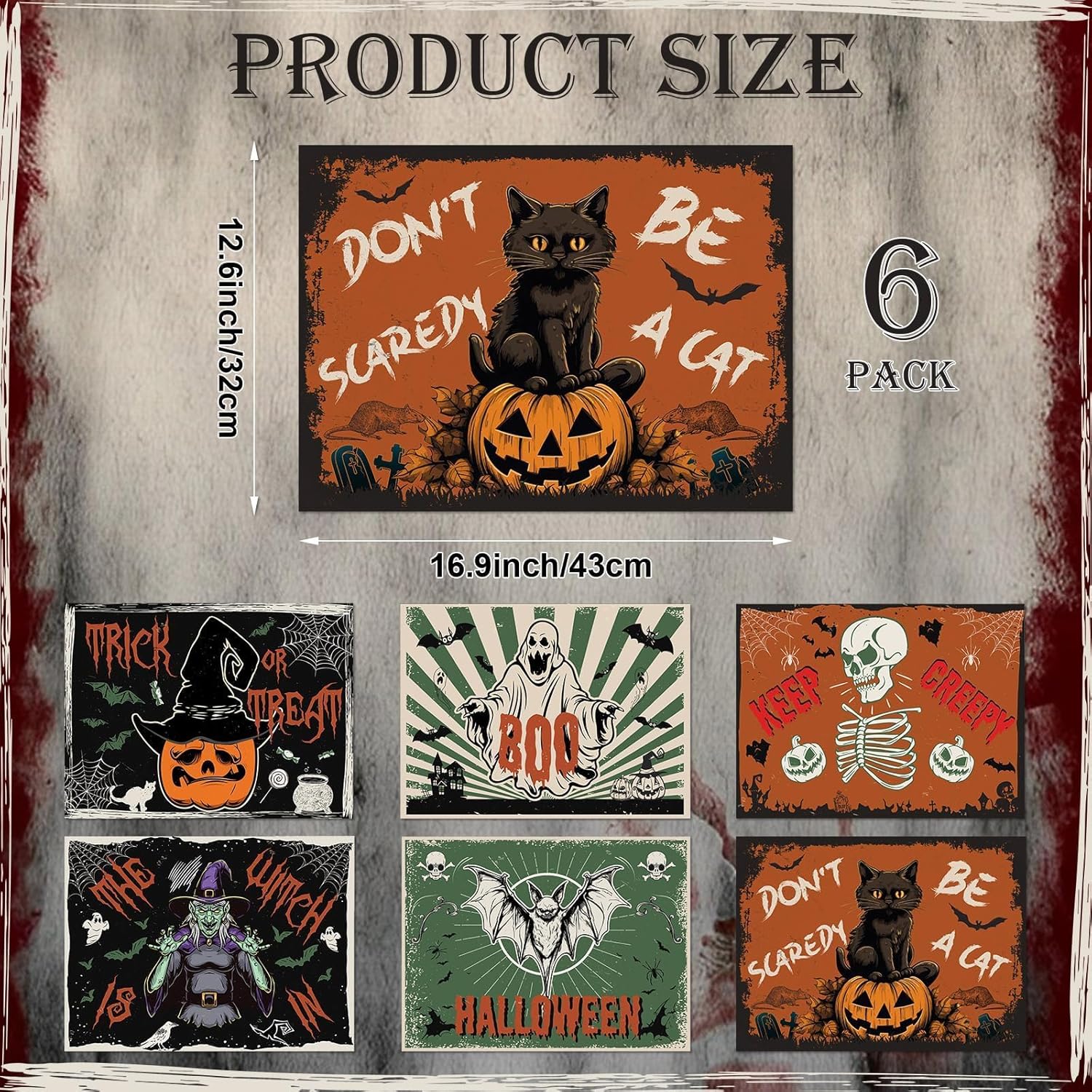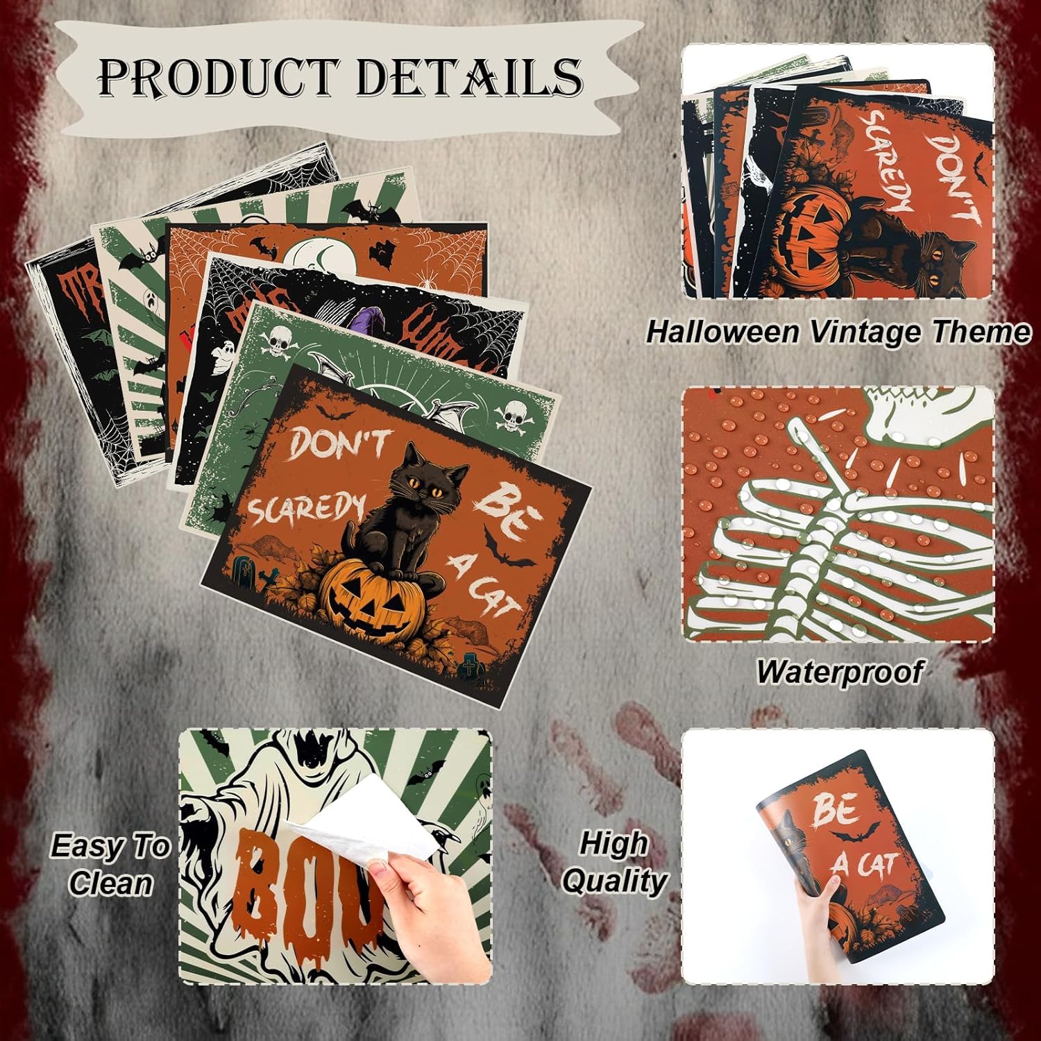 • Easy to clean: Vintage Halloween placemats plastic are easy to clean, does not fade and stain. Wash with a soft sponge or damp cloth and soapy water, and lay it flat or air dry. It is also convenient for you and save your time.