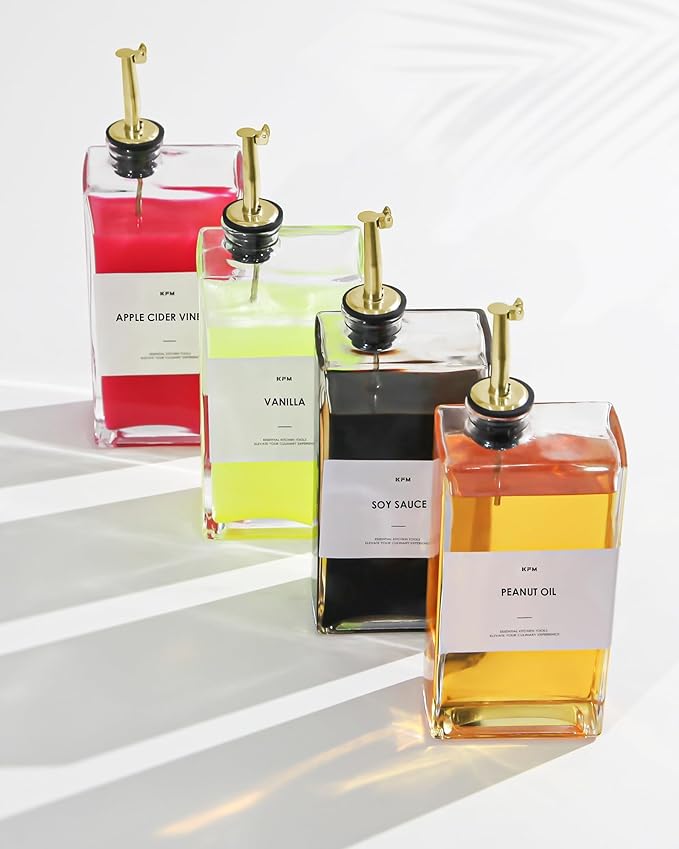 • [17OZ/500ML Large Capacity Oil Dispenser Set]: With elegant rectangular olive oil dispenser bottle set enhance your kitchen decor also very pragmatic. This set includes two high-quality 17 oz (500 ml) glass bottles, four gold pourers, a funnel, and 35 designed labels and 5 blank labels for your custom use.