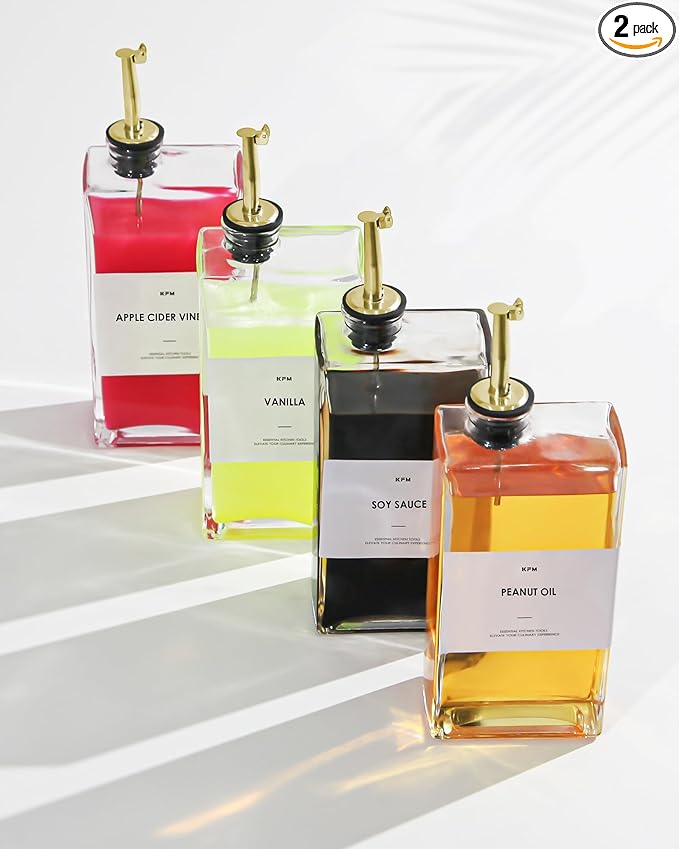 • [12OZ/350ML Large Capacity Oil Dispenser Set]: With elegant rectangular olive oil dispenser bottle set enhance your kitchen decor also very pragmatic. This set includes two high-quality 12 oz (350 ml) glass bottles, four gold pourers, a funnel, and 35 designed labels and 5 blank labels for your custom use.