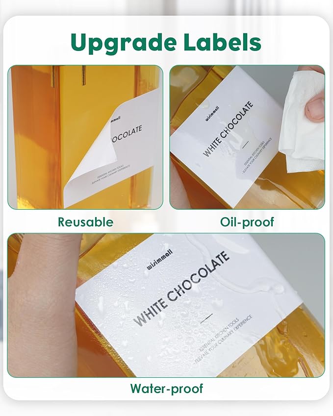 • [Labels Free of Oil Stains]: Each set has 35 complimentary waterproof stain-free labels(for oils, coffee syrups and cooking sauces) with 5 DIY blank labels. the labels are designed to be reused and will not leave any residue upon peeling.