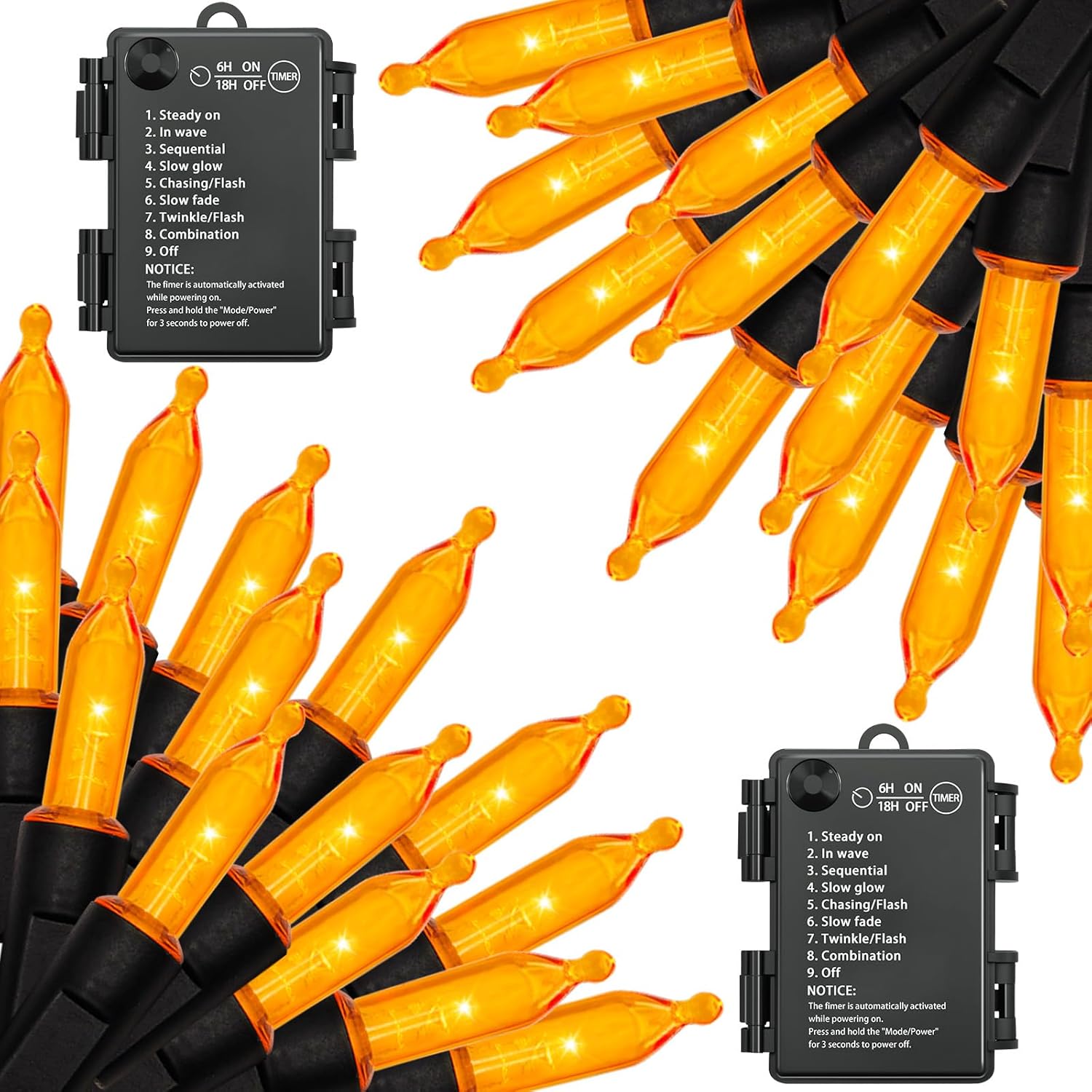 • 【8 Lighting Modes with Timer 】 These Orange Halloween Lights feature fantastic lighting effects with 8 Spooky Lighting Modes and press and hold the mode & power for 3 seconds to power off. Easily switch between Combination, In Waves, Sequential, Slow Glow, Chasing/Flash, Slow Fade, Twinkle/Flash, and Steady On, using the button on the battery case. Automatically controls a 6-hour on/18-hour off timer.