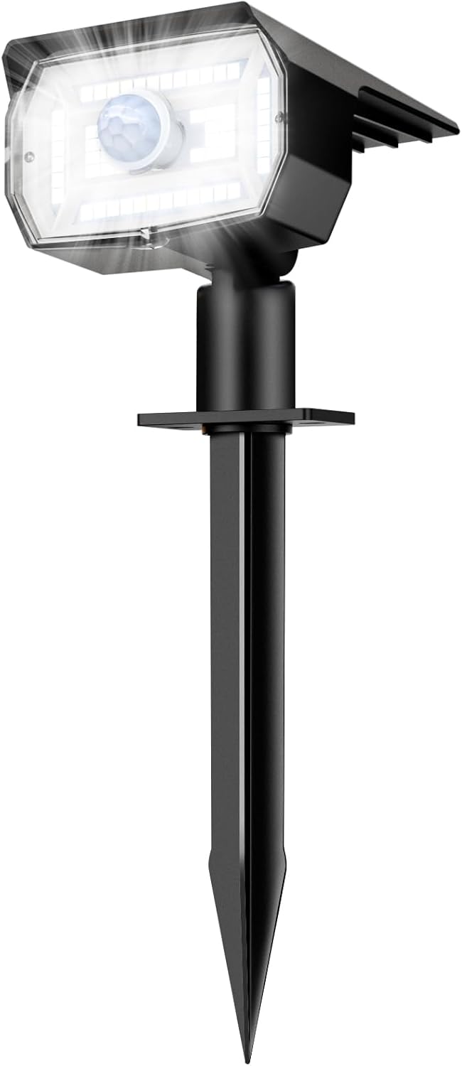 • 3 Lighting Modes & Motion Sensor: Solar spotlights have a built-in sensitive PIR motion sensor, which can easily capture motion. There are 3 modes:1.[Sensor light mode]: full brightness when the motion is detected,close when no motion 2.[Dim light sensor mode]:low brightness no motion,full brightness when the motion is detected 3.[ Constant light mode]: auto power on at night, auto power off during the day