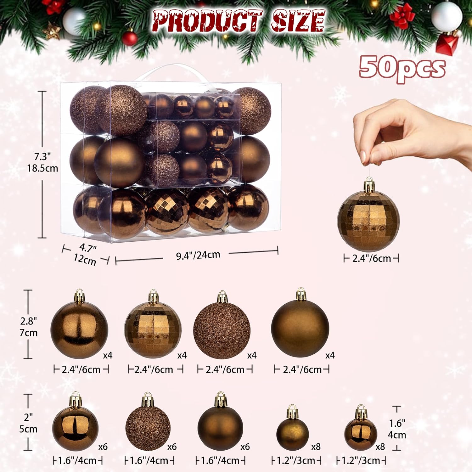 50pcs Christmas Ball Ornaments Brown Shatterproof Christmas Tree Ball Decorations Xmas Tree Large Xmas Ornaments Balls with Hanging Loop for Xmas Wedding Holiday Party Wreath Home Decor