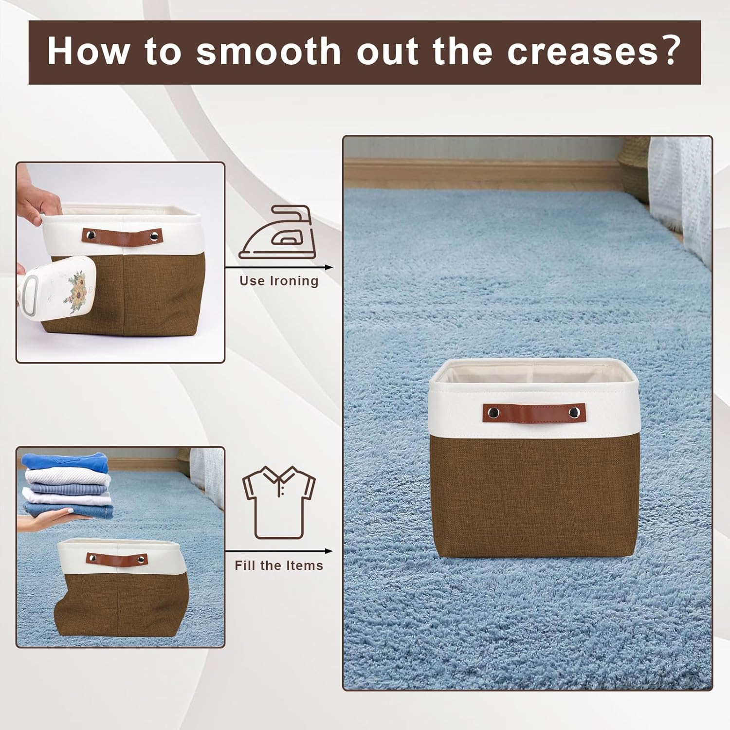 • 【Maintenance & Care Tip】 - Collapsible design for space saving. Our foldable baskets comes in a compression packing which may result in wrinkled storage bin during the long transit. Get rid of the wrinkles by either stuffing the fabric storage bins with blankets and pillows for a few days or steam iron them at low-heat setting. The organization baskets are easy to clean, you can dust the basket with a soft cloth with light soapy water when needed. Not recommended to machine wash.