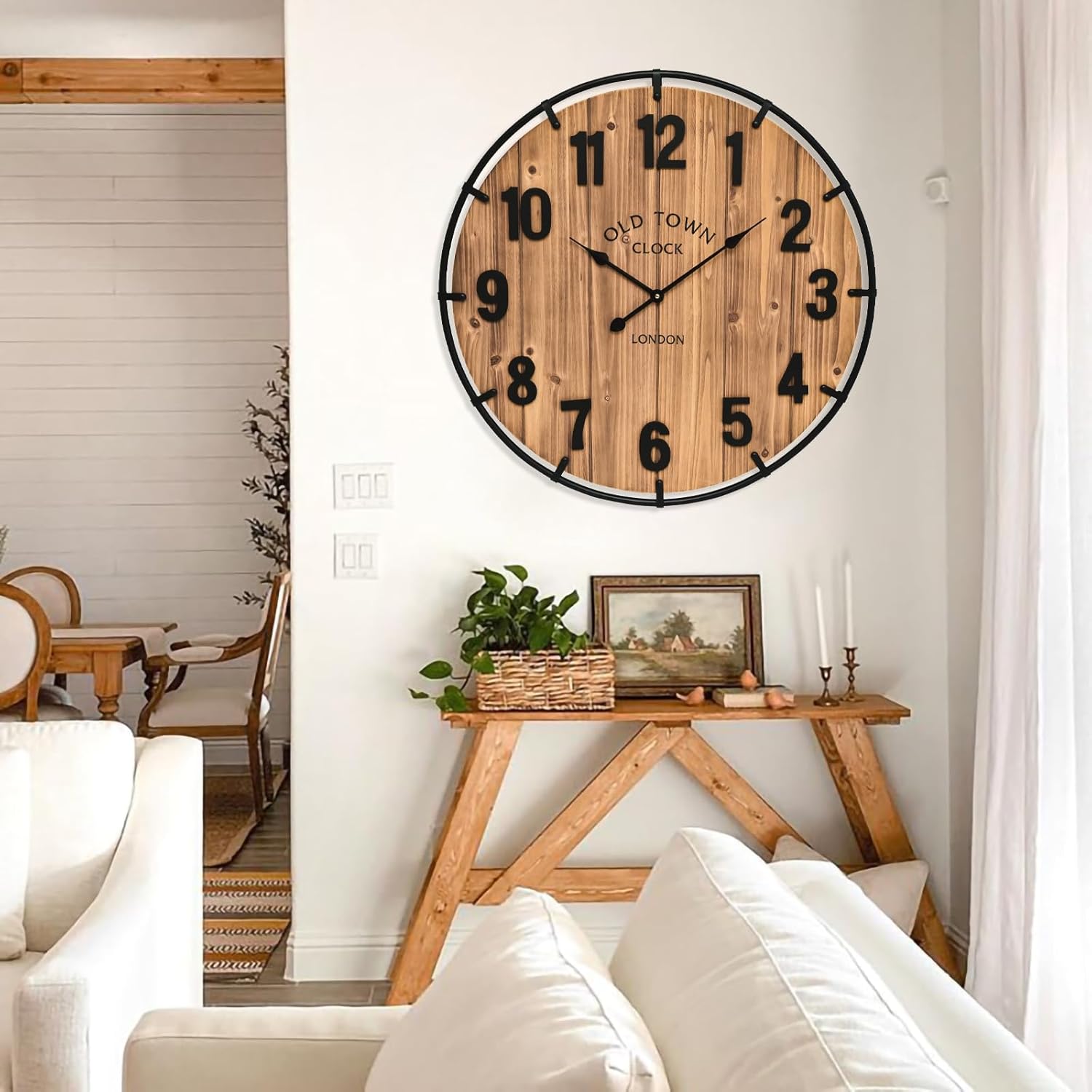Large Old Town Farmhouse Wall Clock 30 Inches Rustic Antique Wood with Metal Circle and Large Numerals Silent Battery Operated Wall Clock for Office Kitchen Bedroom Living Room
