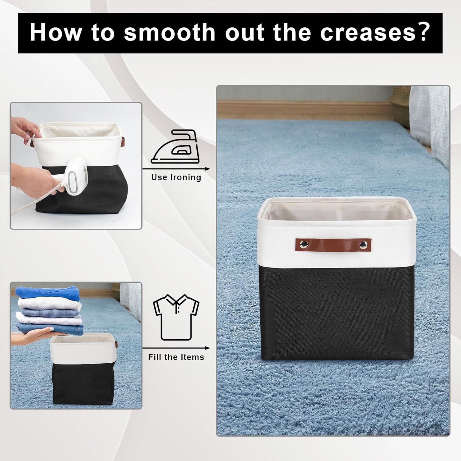 • 【Maintenance & Care Tip】 - Collapsible design for space saving. Our foldable baskets comes in a compression packing which may result in wrinkled storage bin during the long transit. Get rid of the wrinkles by either stuffing the fabric storage bins with blankets and pillows for a few days or steam iron them at low-heat setting. The organization baskets are easy to clean, you can dust the basket with a soft cloth with light soapy water when needed. Not recommended to machine wash.