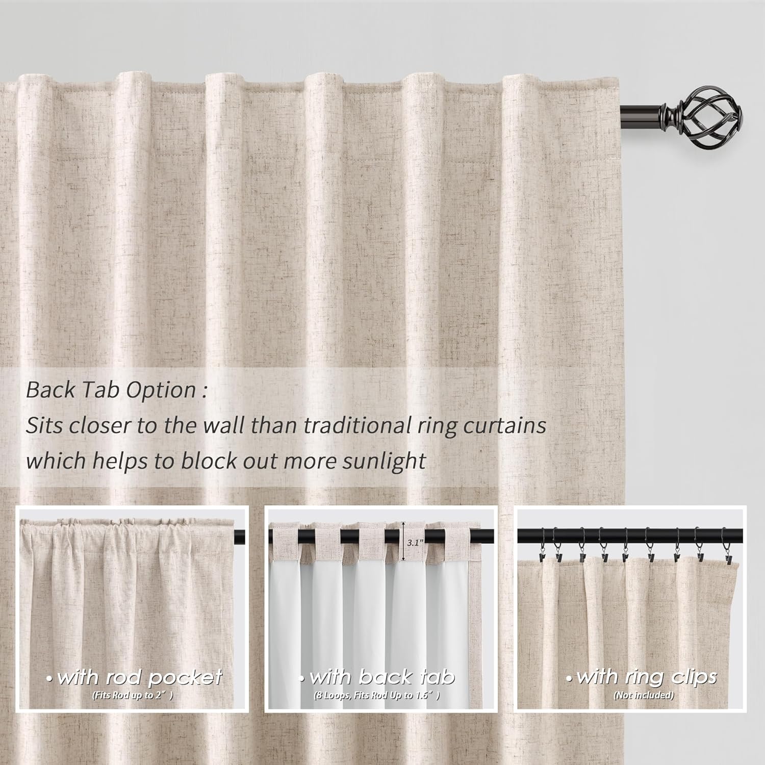 • 3 Hanging Options: Differ from the traditional curtains with grommet, BOODII linen curtains with back tab and rod pocket can full block sunlight fully. (1) Using the back tabs design to create an elegant pleated look and sit closer to the wall than traditional ring curtains, which helps to block out more sunlight; (2) Using rod pocket for a classic effect; (3) Using clip rings on track system or curtain rod, slide open/closed easily (clip rings are not included).