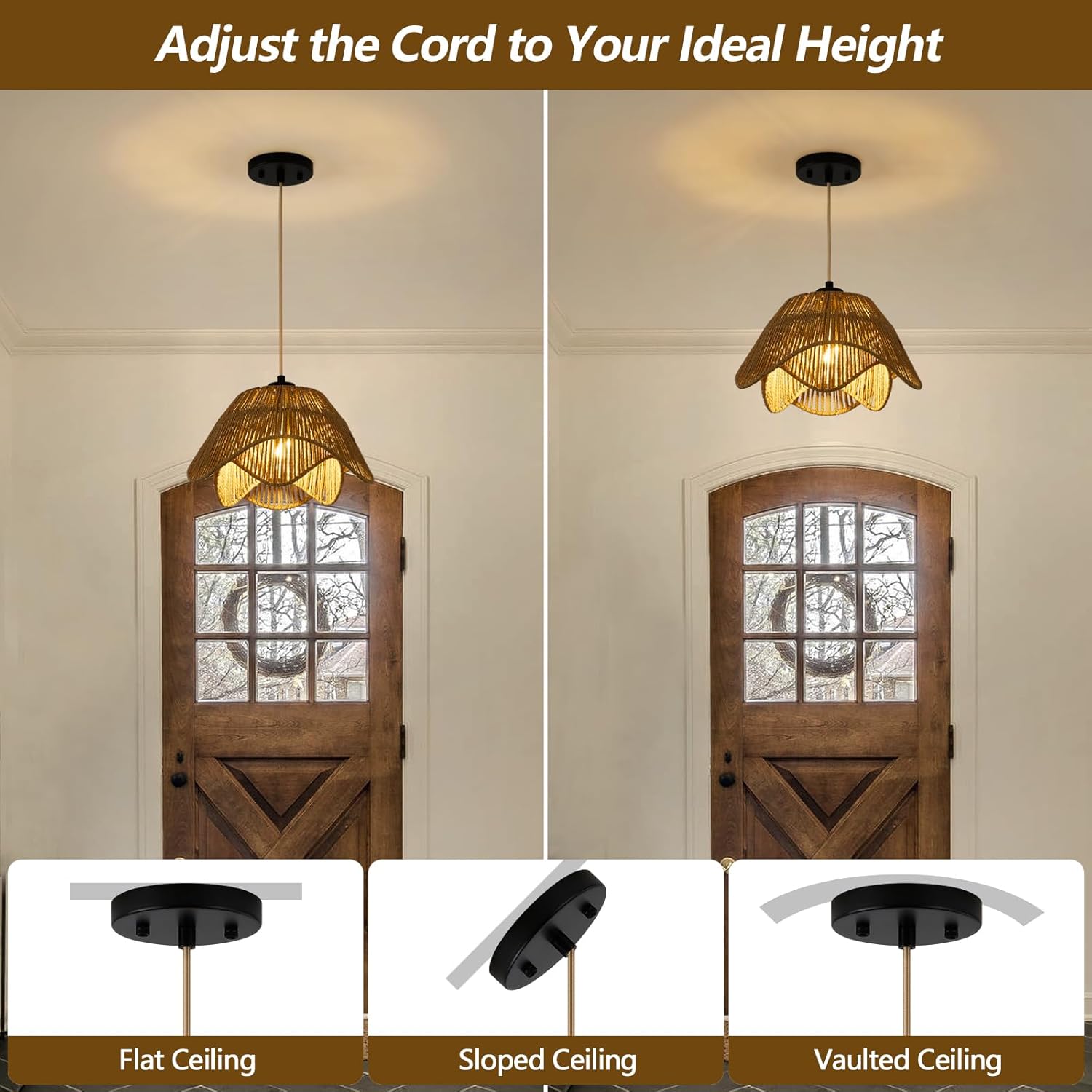 • 【Height adjustable】Boho chandelier size:D 12.59" x H 7.08". The 55.1 inch cord provides enough length for you to adjust the rattan pendant light to the desired height for your lighting needs according to your preference and design, also suitable for vaulted or sloped ceilings.