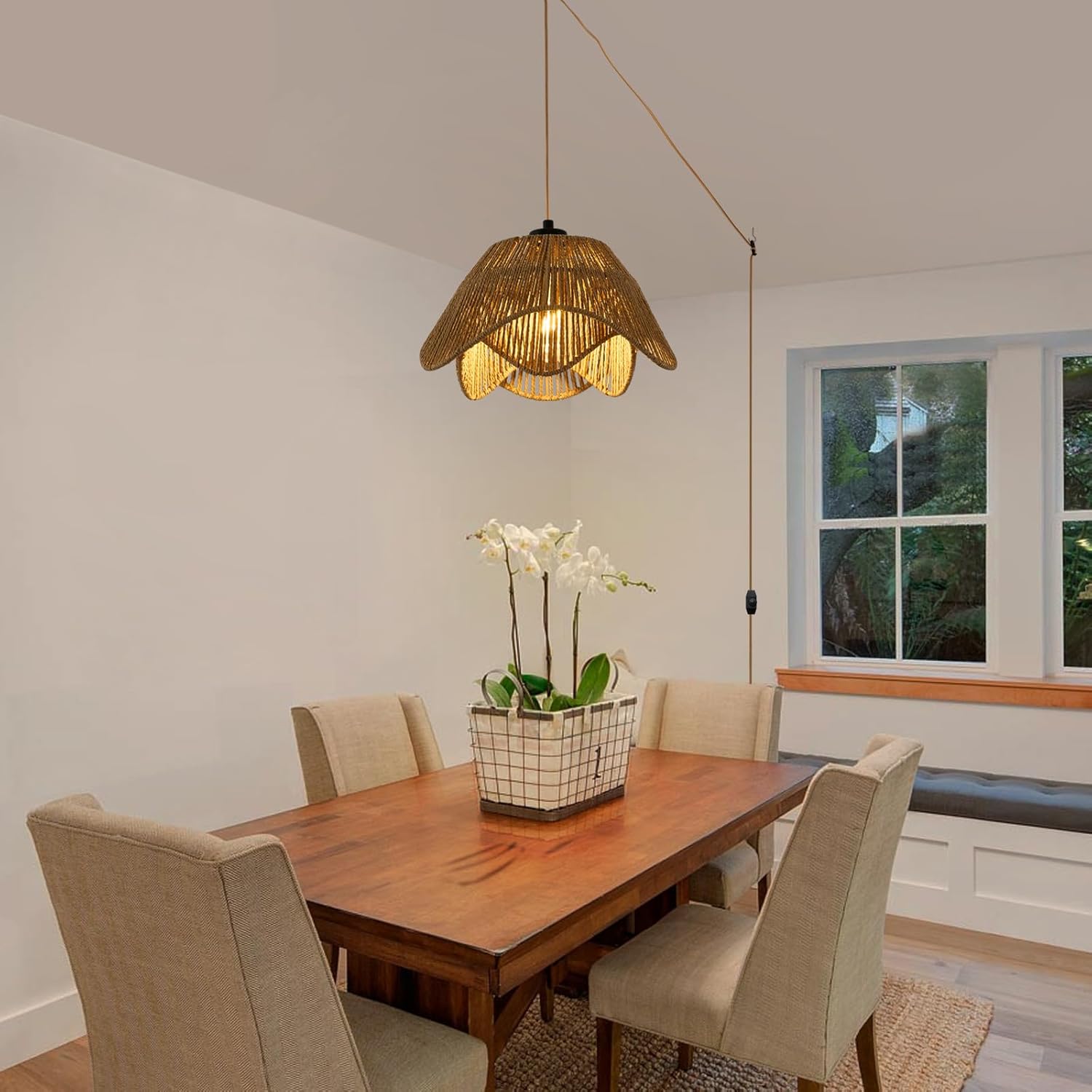 • 【Rattan Plug In Pendant Light】Comprised of a hand-woven rattan shade and a 14.76 ft dimming plug cord, this plug in hanging light is lightweight and easy to install, making it easy to bring a touch of bohemian chic to your space. The light diffuses soft light and beautiful shadows through the rattan shade, creating a cosy and warm atmosphere.