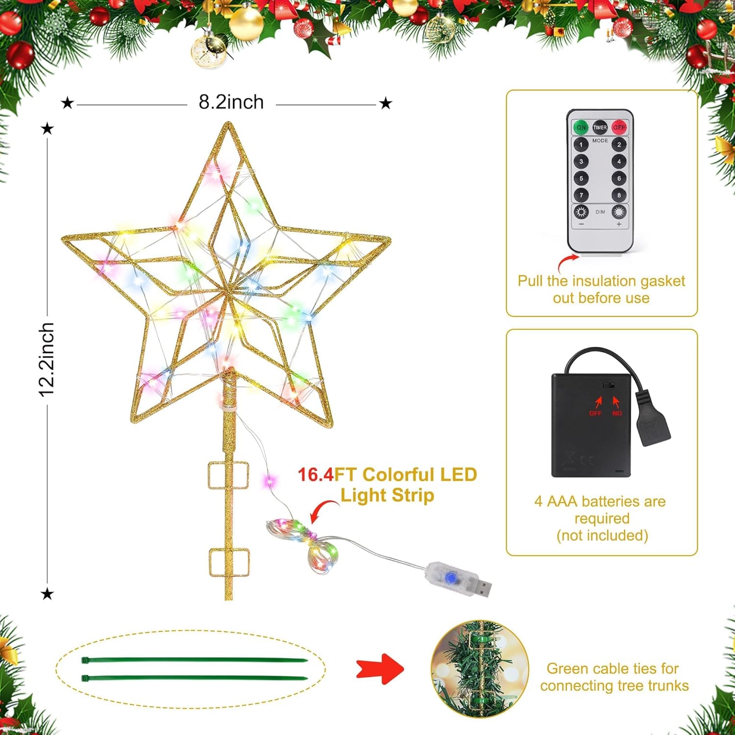 Christmas Tree Topper,50 LED Lighted Sparkling Star Tree Toppers Christmas Decorations,8 Lighting Modes Gold Star Xmas Decorations with Remote Control and Extra Battery Box,Glitter Christmas Ornament