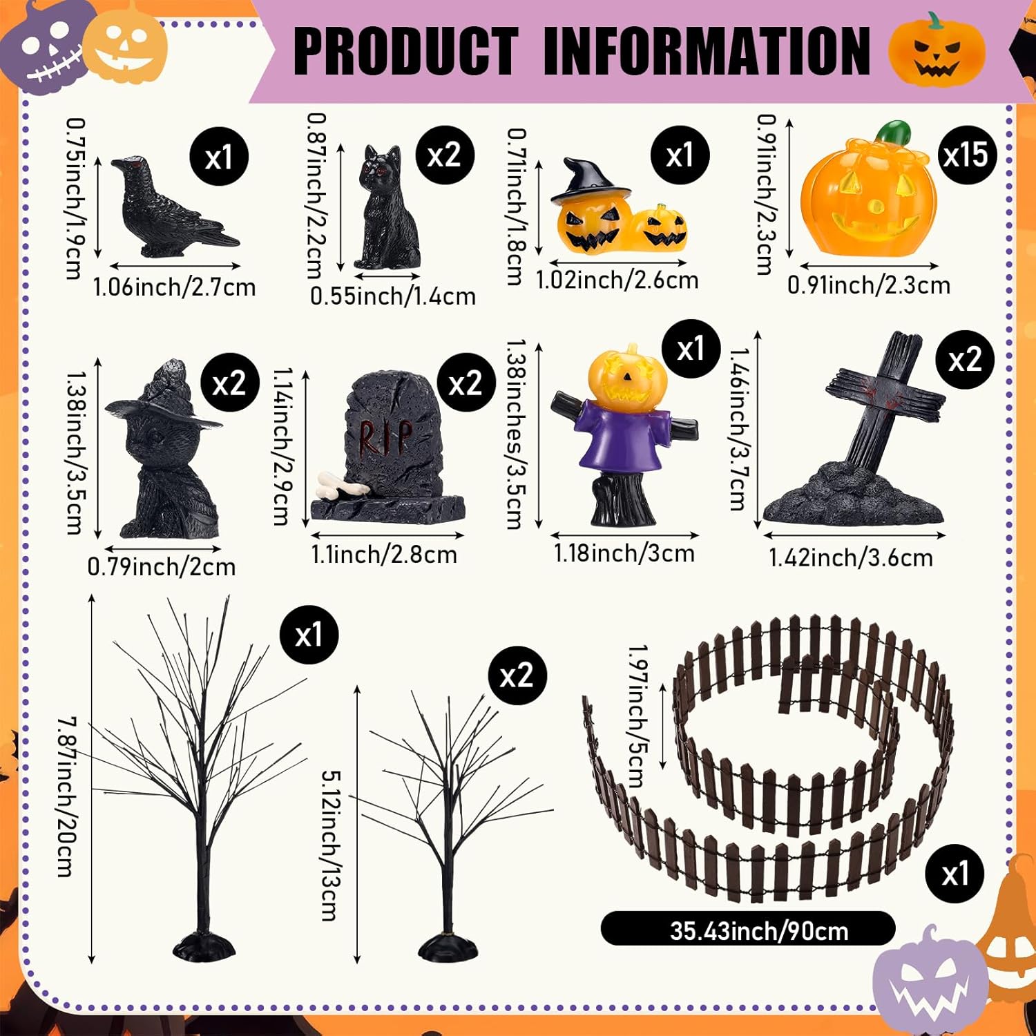 Wesiti 30 Pcs Halloween Village Accessories Set Miniature Halloween Figurines Village Trees Cat Pumpkin Tombstones Figurine Horror Miniature Accessories for Garden Decor