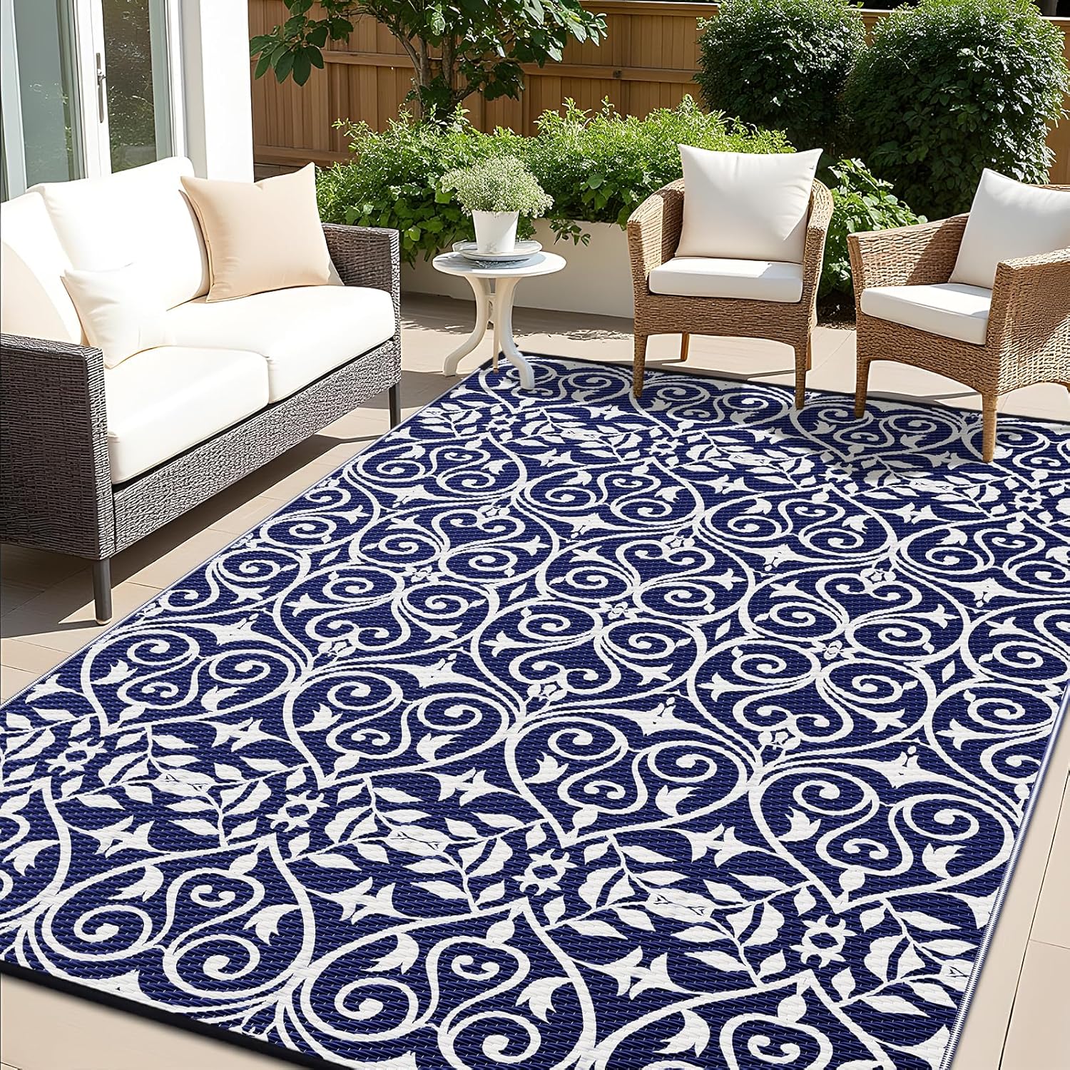 OLANLY Outdoor Rug Waterproof 9x12 ft Clearance, Reversible Outdoor Plastic Straw Rug with Floral Pattern, RV Mat for Patio, Camping, Balcony, Deck, Backyard, Navy & White